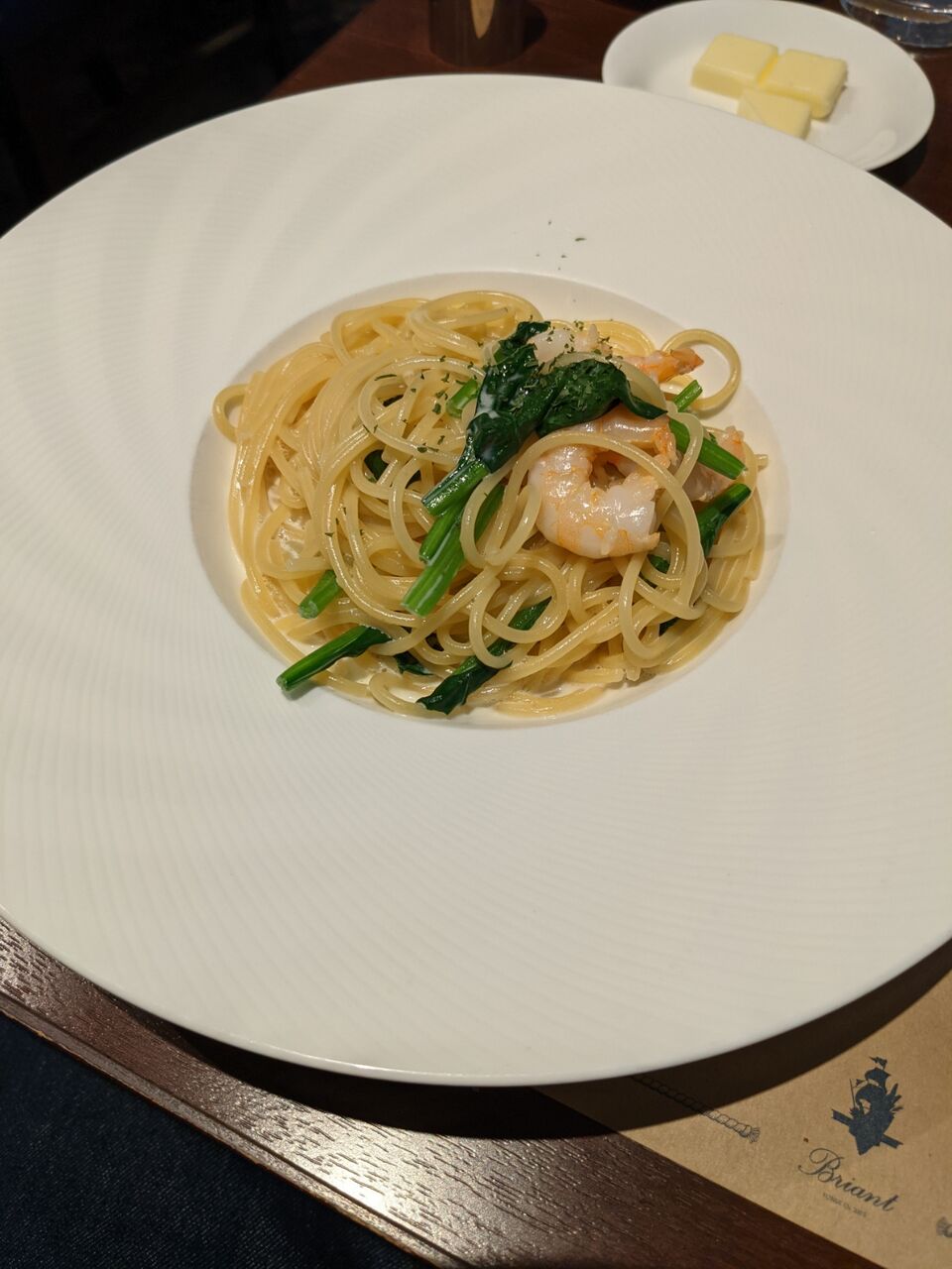 ※小エビとほうれん草のクリームソーススパゲティ。エビがたくさんはいっていました。少なめですが、パンを食べないといけないので助かります。