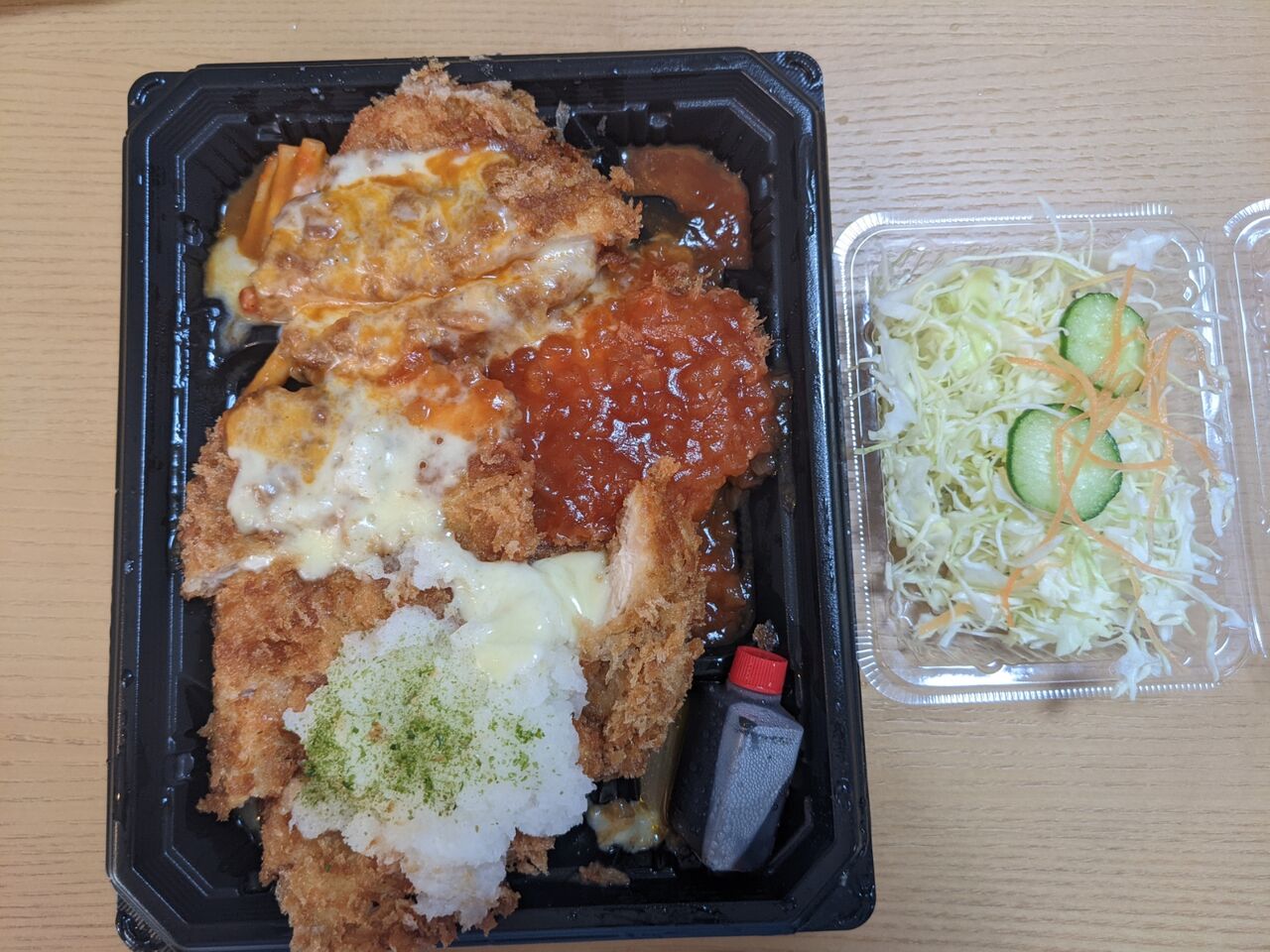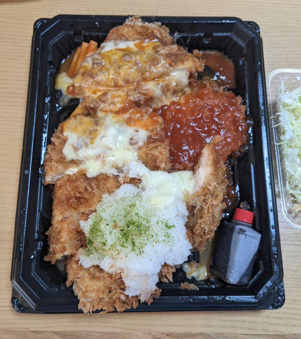 ケチャップオニオンソース、チーズ、おろしポン酢がチキンカツに乗っています。