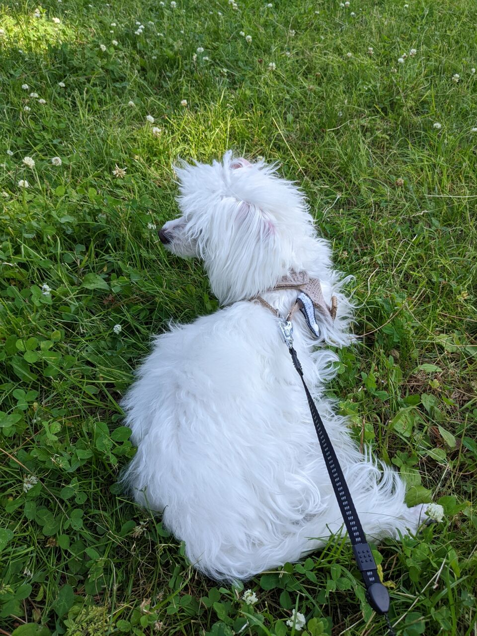 ・犬と一緒に木陰に座っておやつを楽しみました。テイクアウトカップは紙の容器でした。