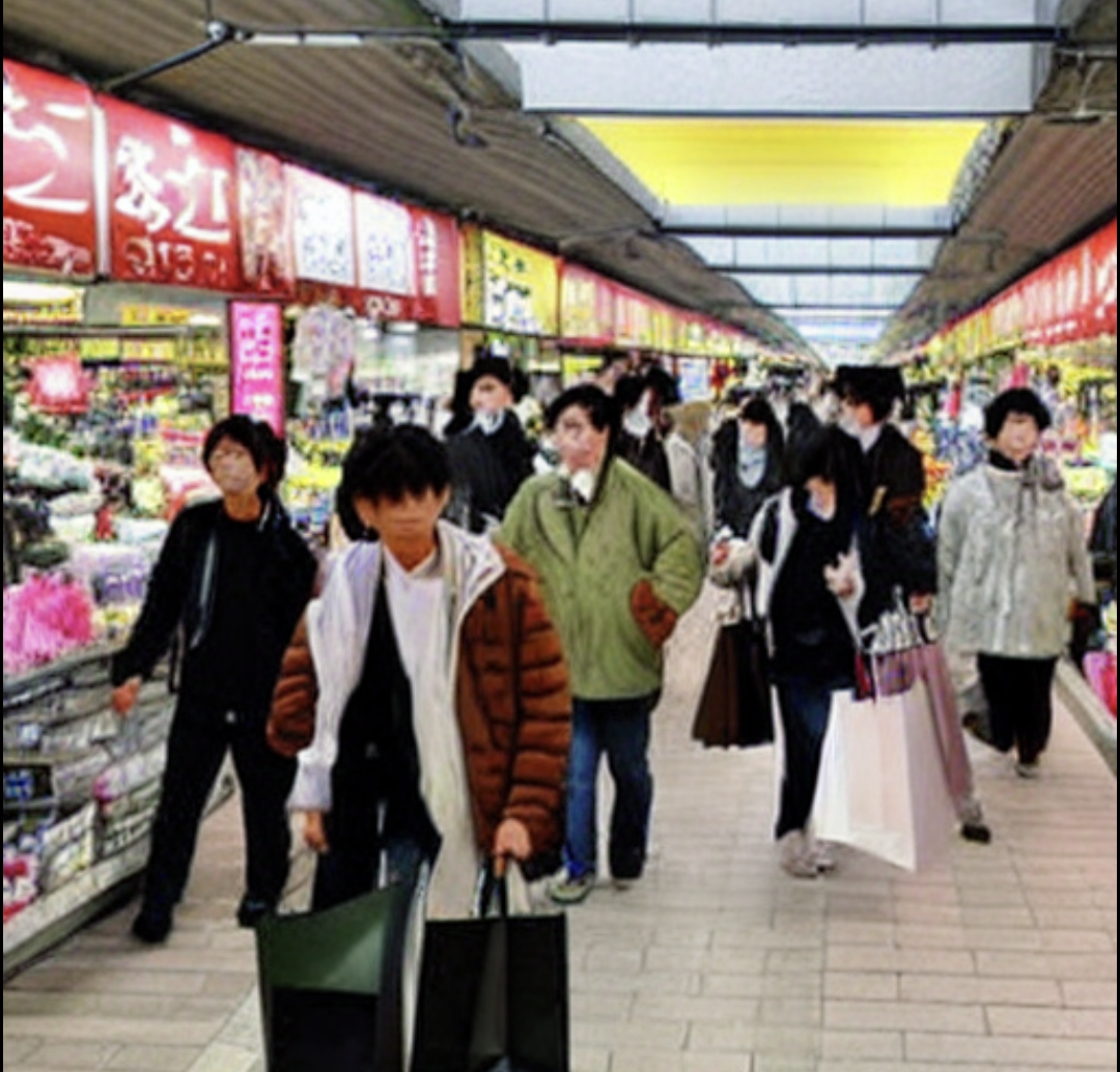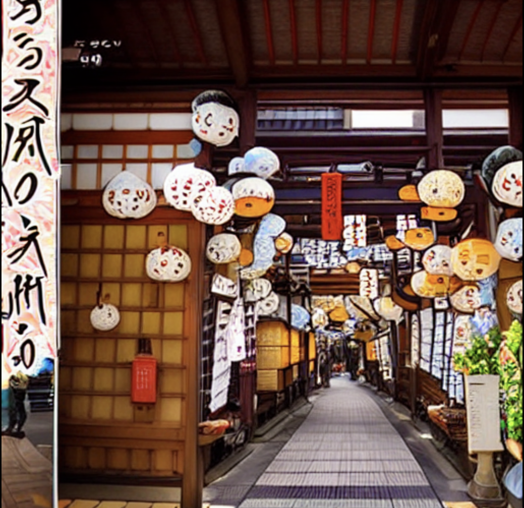 ・当ブログの人気記事タイトルで描いてもらいました。りくろーおじさんの姿はなく、りくろーおじさんがやってくるであろう通路に歓迎の提灯が無数に飾られています。手前にあるのぼり旗の文字が呪文のようで恐いです。旗の後ろに人影があるのも恐いですね。