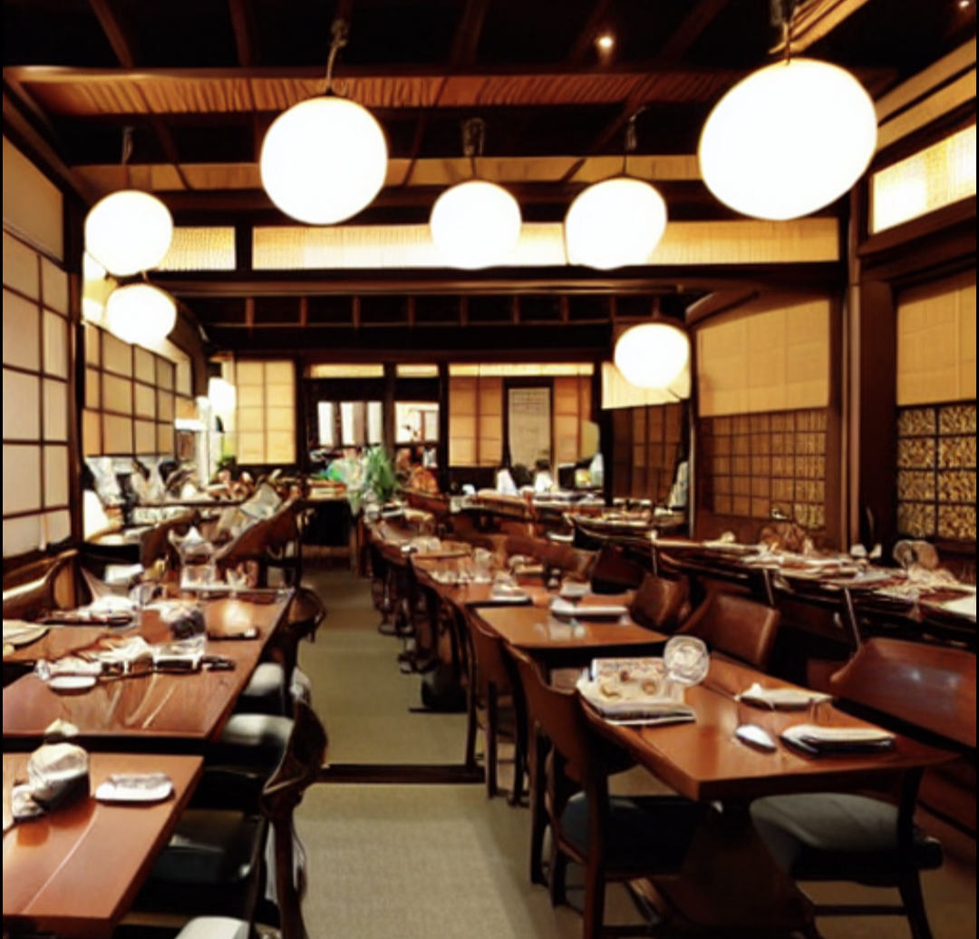 ・当ブログの人気記事タイトルで描いてもらいました。京都の料亭の宴会場のような景色です。食べ終わったお皿があったり、テーブルセットしてあったり繁盛しているお店なんだと思います。しかし、人の姿はなくどんなデカ盛りが運ばれてくるのか不安になります。