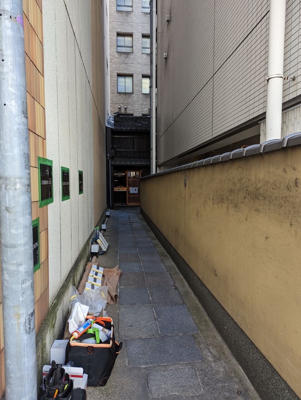 四条烏丸を西に行ったところの元【にぼ次朗・カレー得正】があった路地奥の店舗が改装工事をしていました。