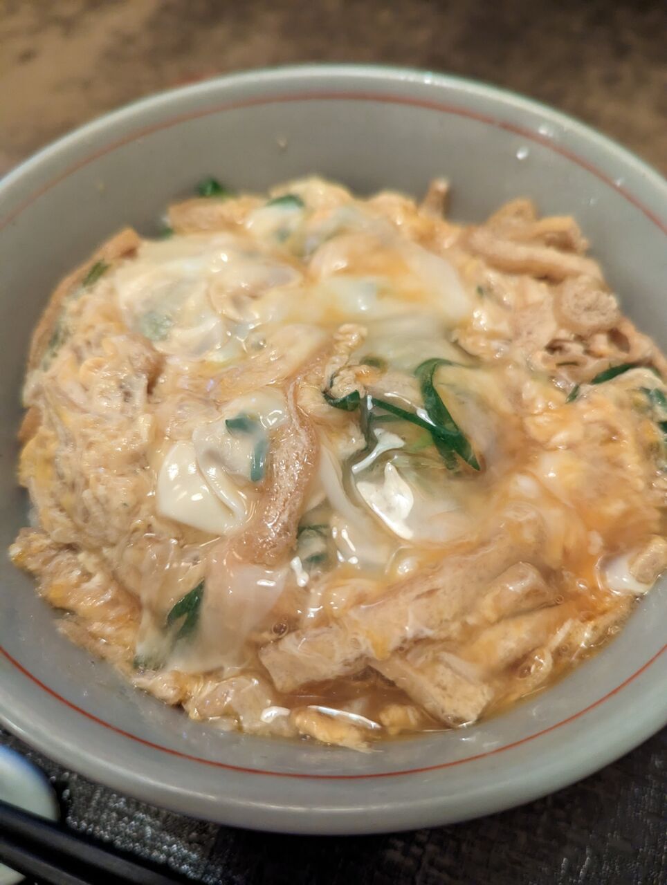 ・甘辛く炊いて細切りにした油揚げを卵とじにした京都のご当地丼です。他府県にも似たような物はあるようですが「きつね丼」と呼ばれています。