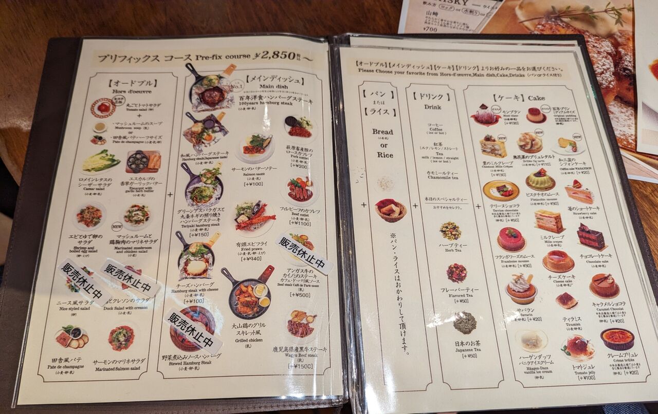 ・「オードブル」「メインディッシュ」「パンライス」「ドリンク」「ケーキ」を選ぶディナーコースを食べました。