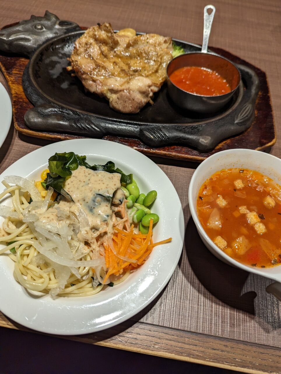 ・サラダバー、スープバーが人気でした。看板メニューはステーキでしたが最近牛肉が続いていたのでチキンステーキにしました。