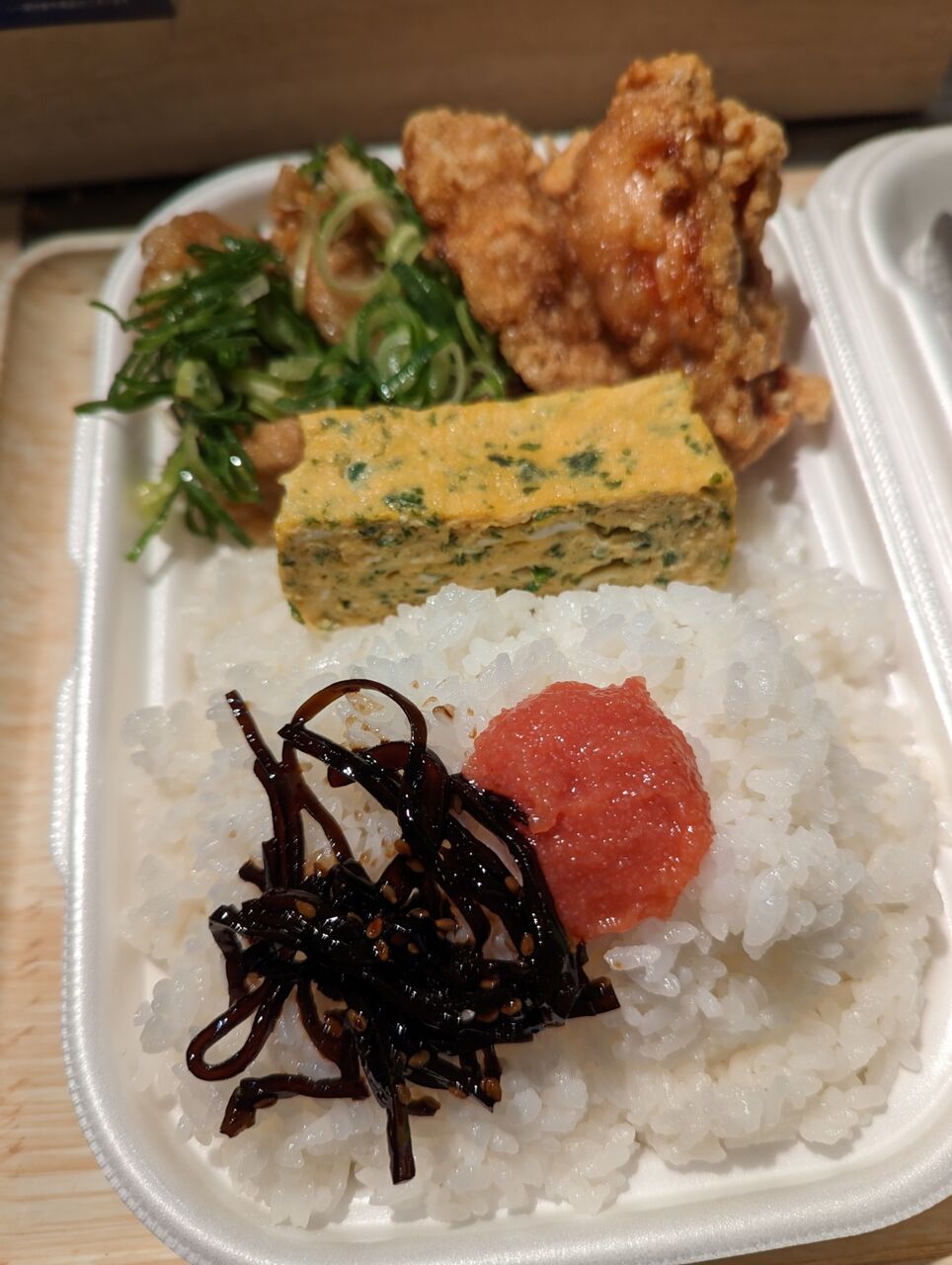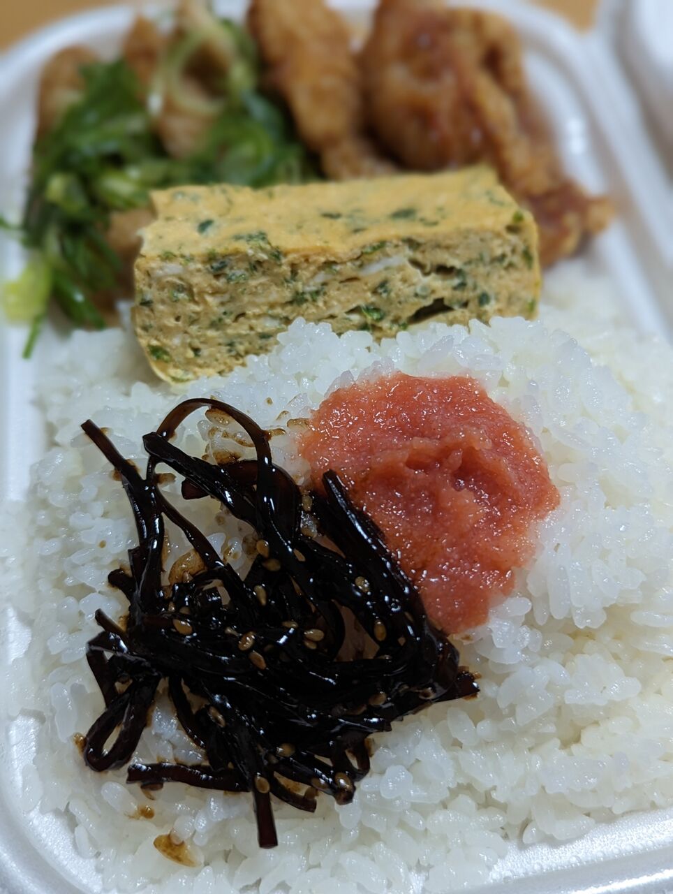・【から揚げ弁当】のご飯には「明太子昆布」か「海苔おかか」がついてきます。
