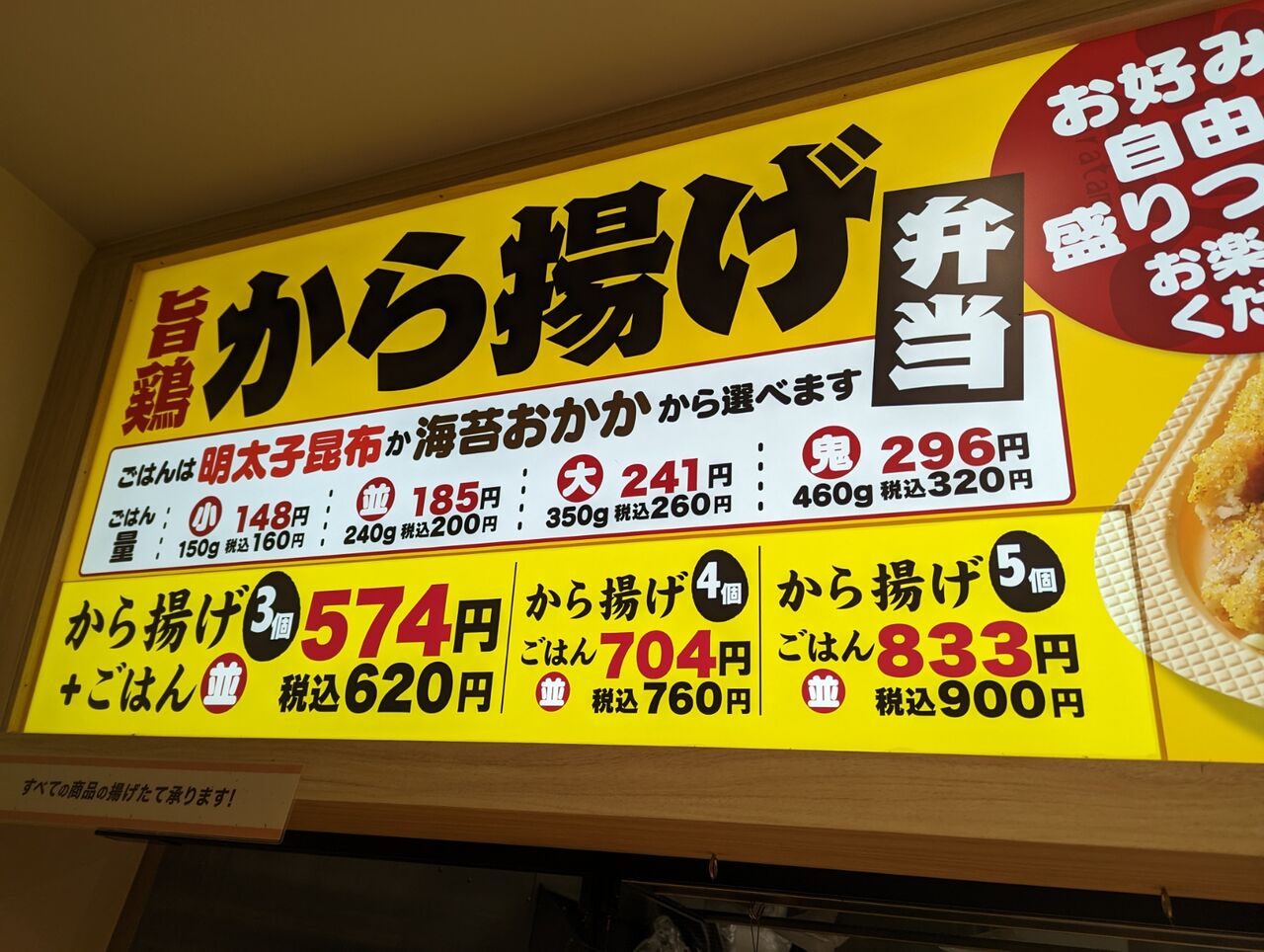 ・注文口で【から揚げ弁当(鬼盛)】を注文すると、鬼盛ご飯が入って「おかず」がない状態の弁当容器が渡されて「丸亀製麺の天ぷら」のように自分で自由に好きなから揚げ等を取って総額をレジで支払います。