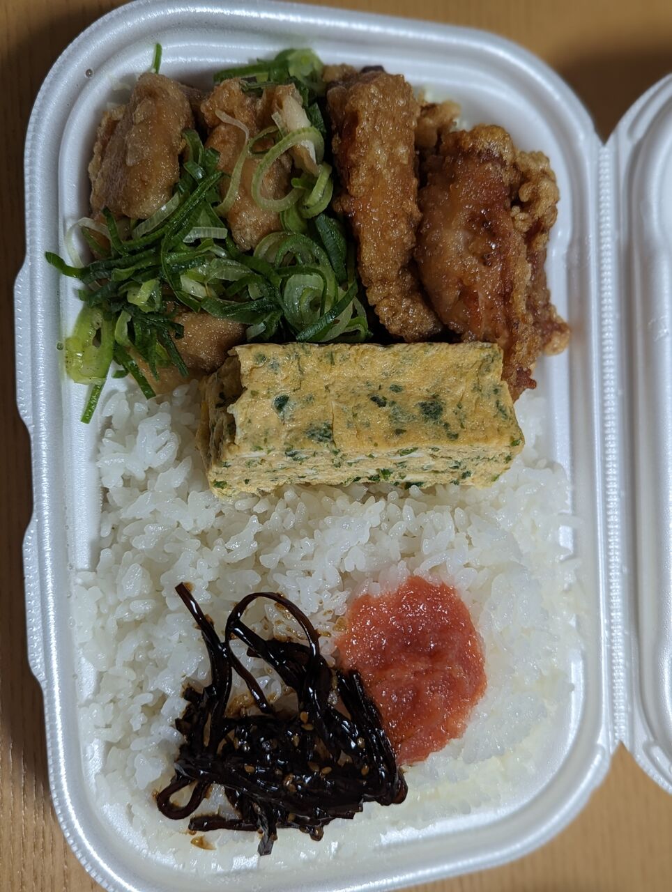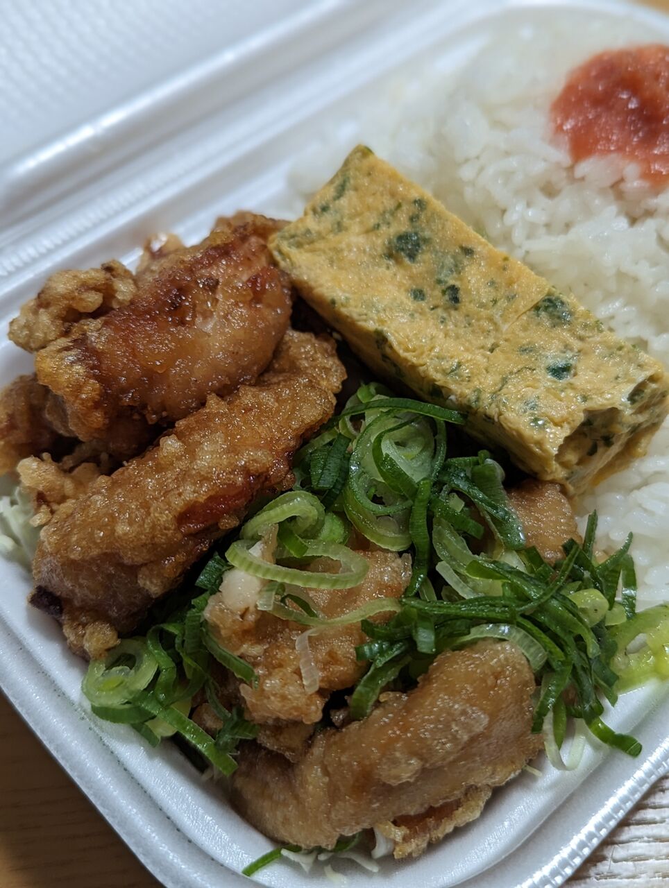 ・ネギ塩から揚げ2個、にんにくしょうゆから揚げ2個、あおさだし巻き1個取りました。