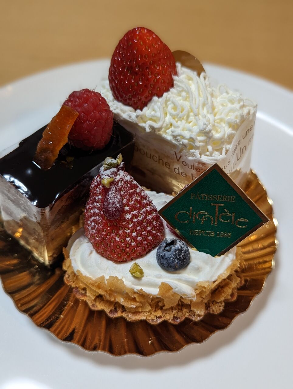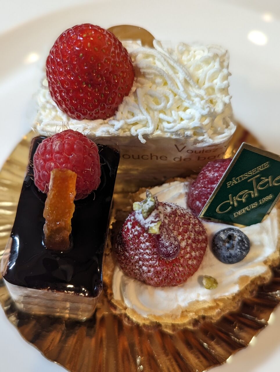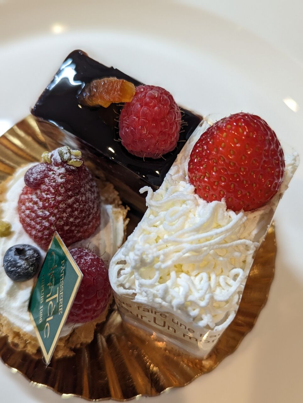・「ショコラ」と「イチゴのケーキ」と「ベリータルト」のミニケーキが3つで1人前になった贅沢なケーキです。