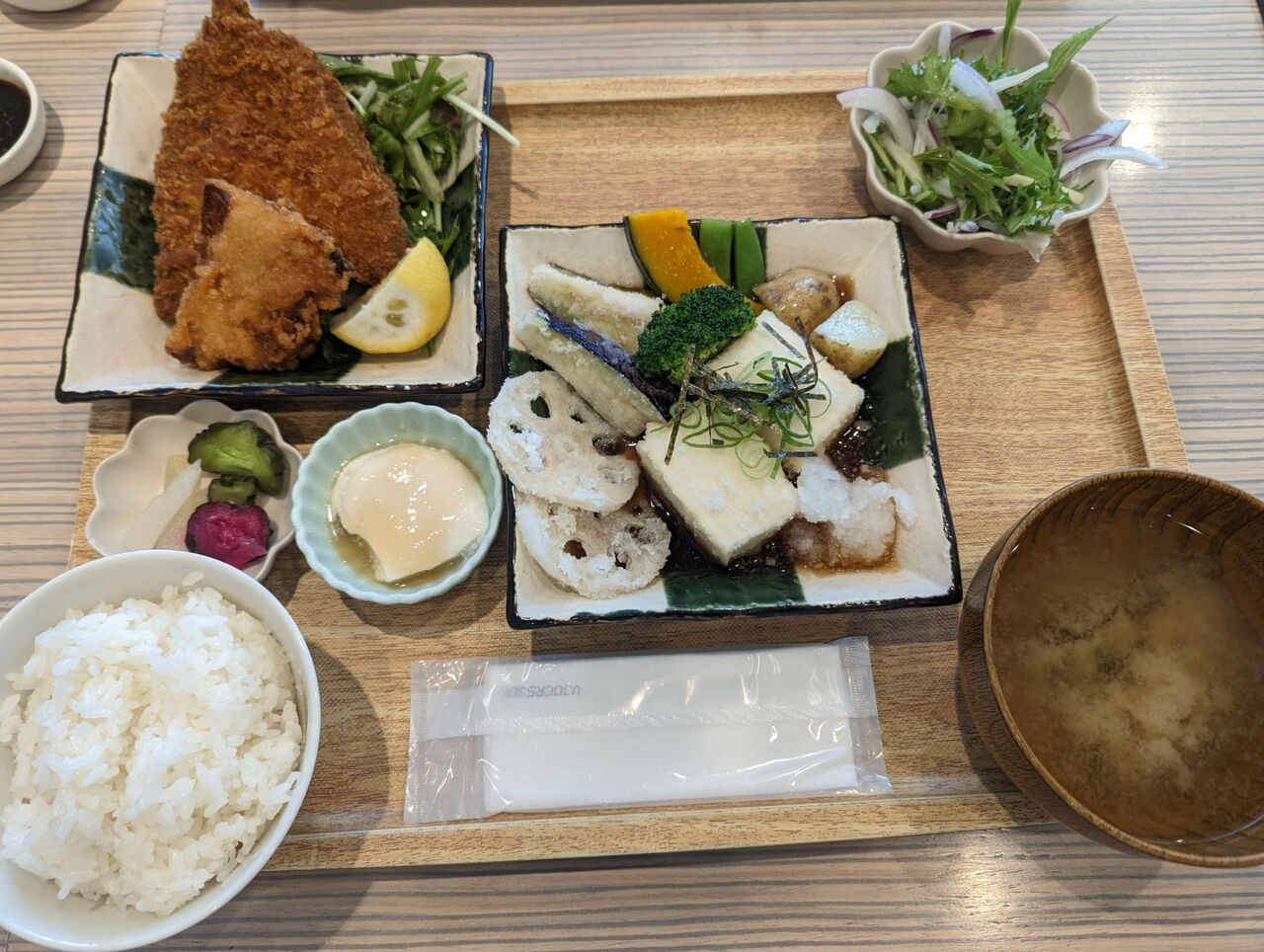 揚げ出し豆腐と季節野菜の定食(アジフライ、鶏の唐揚げ追加) 1419円