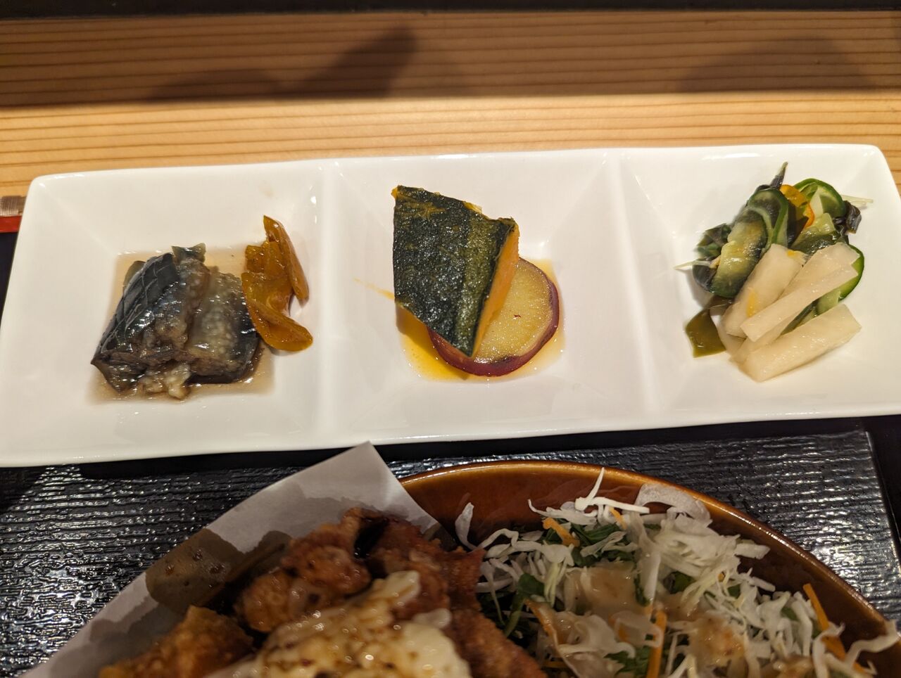 ・からあげメインで、おばんざい3種とごはんとみそ汁の定食です。