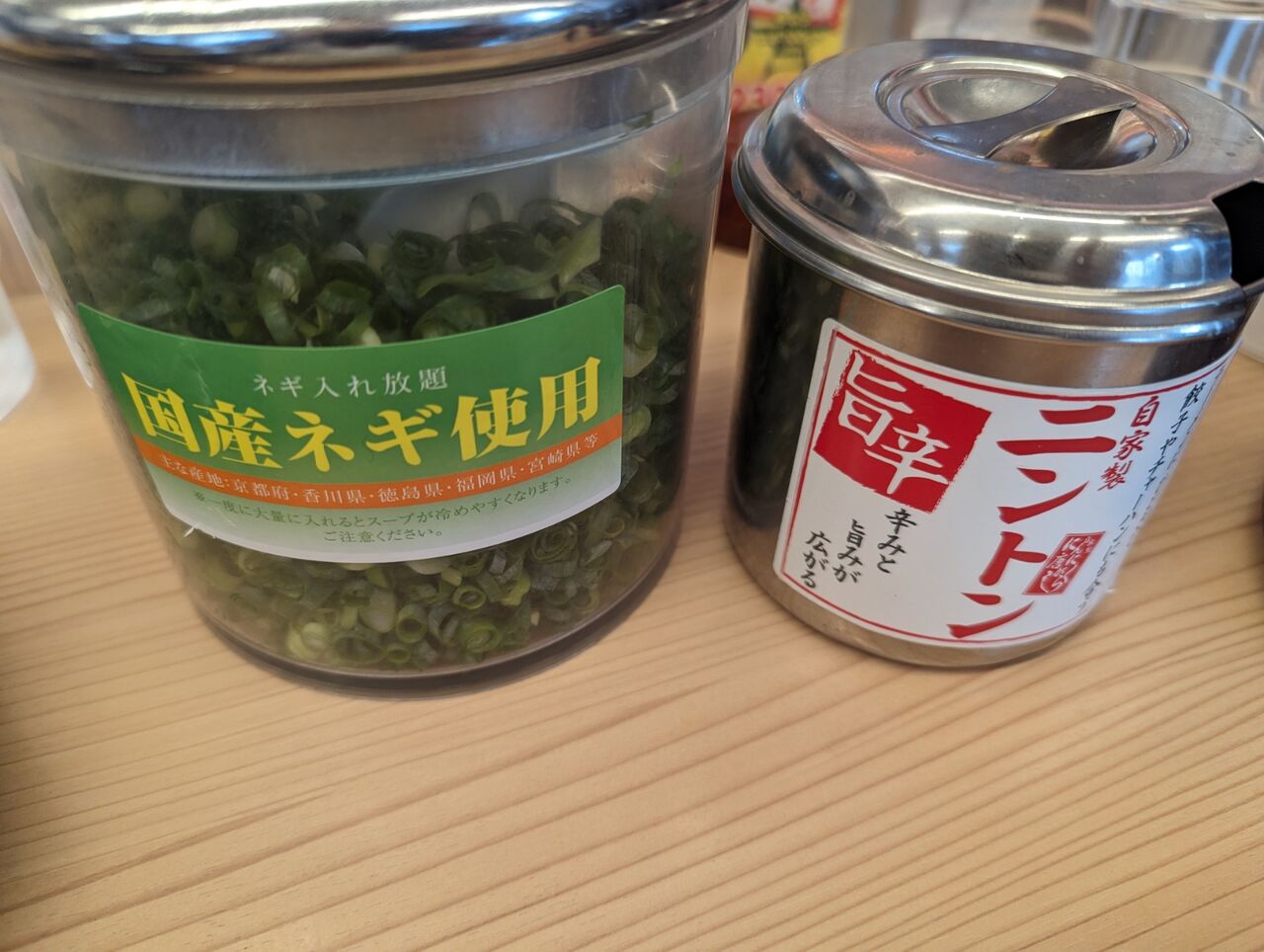 ▼ラーメン横綱といえば「国産ネギ入れ放題」と「自家製ニントンによる味変」です。