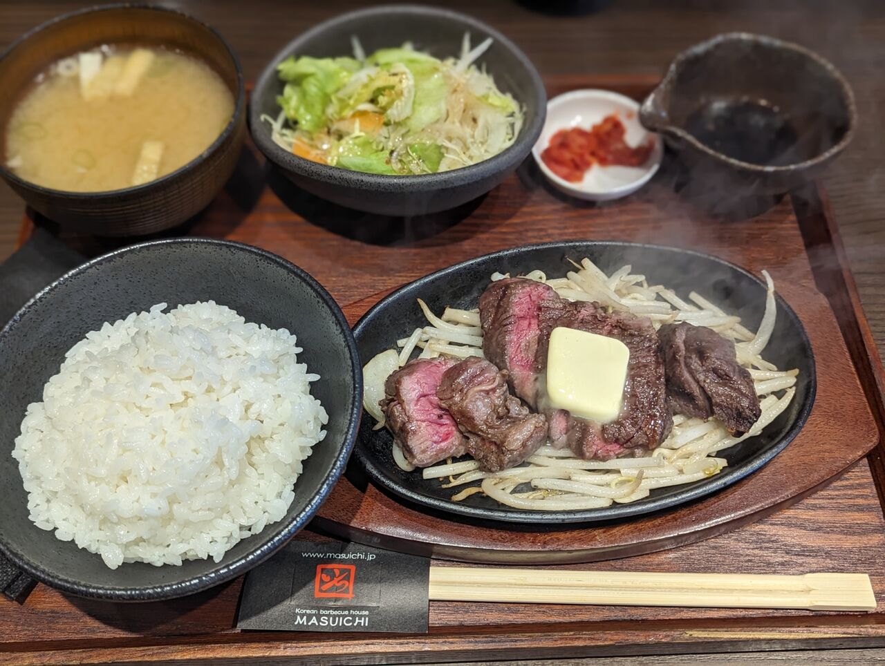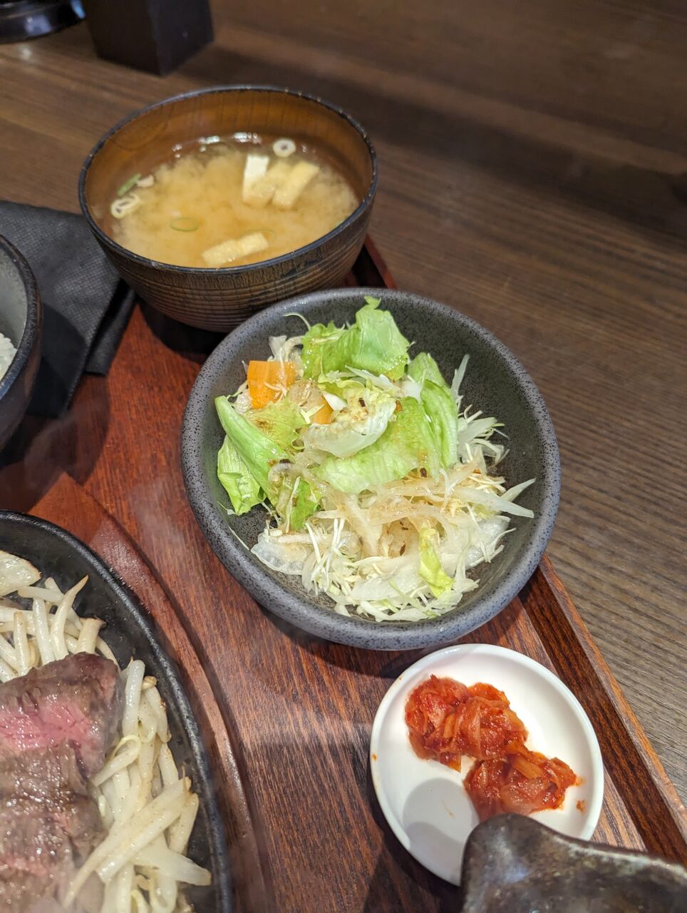 ・サラダとみそ汁とキムチがついてきます。