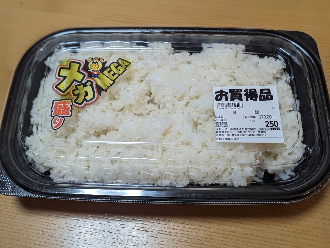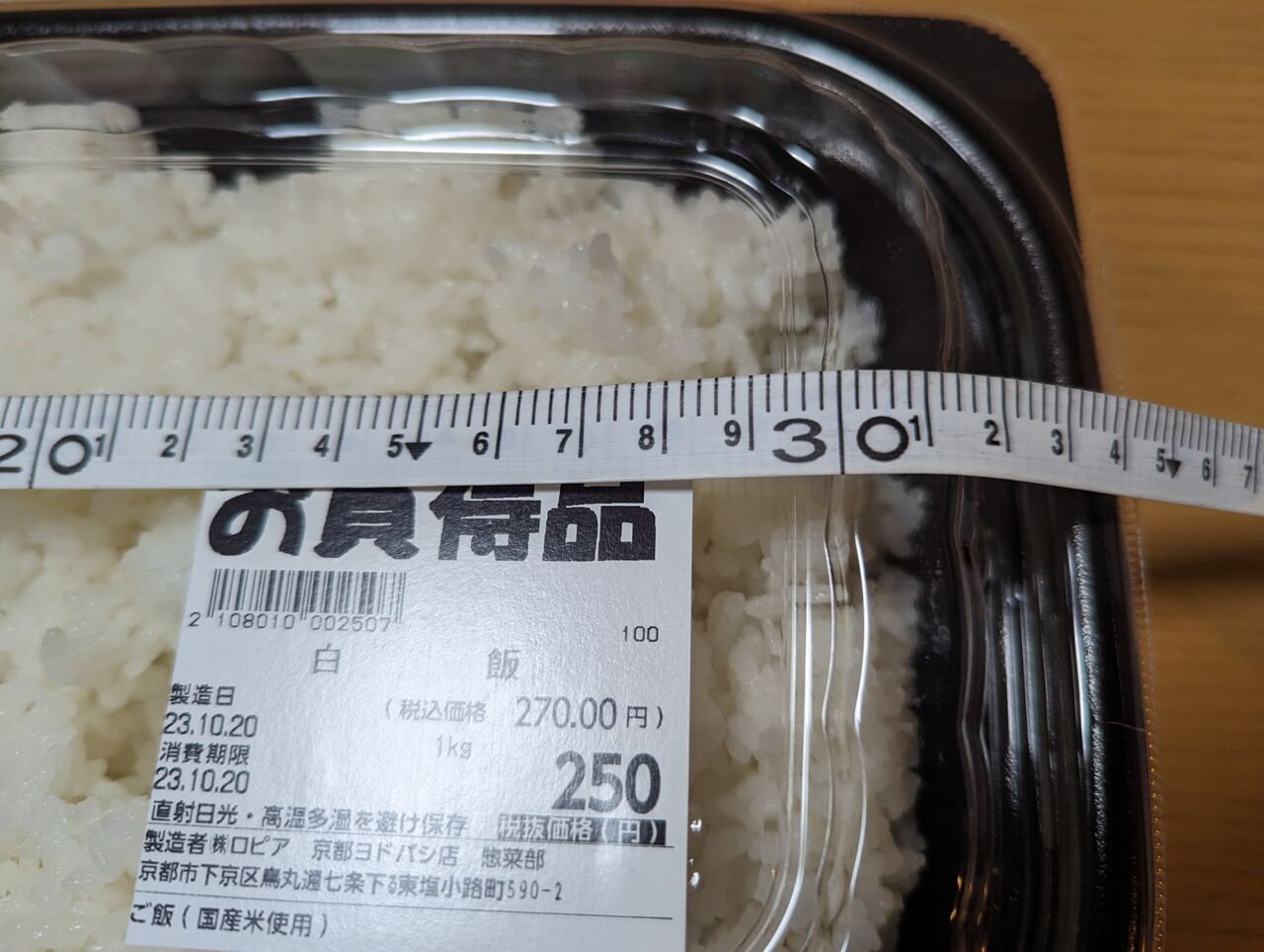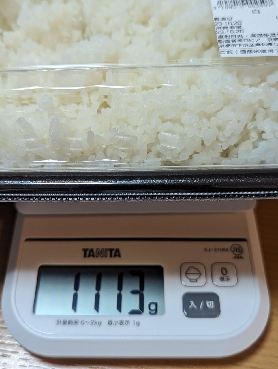 ・30cm×20cm、表記より100g近く多い1113gの大容量白飯でした。