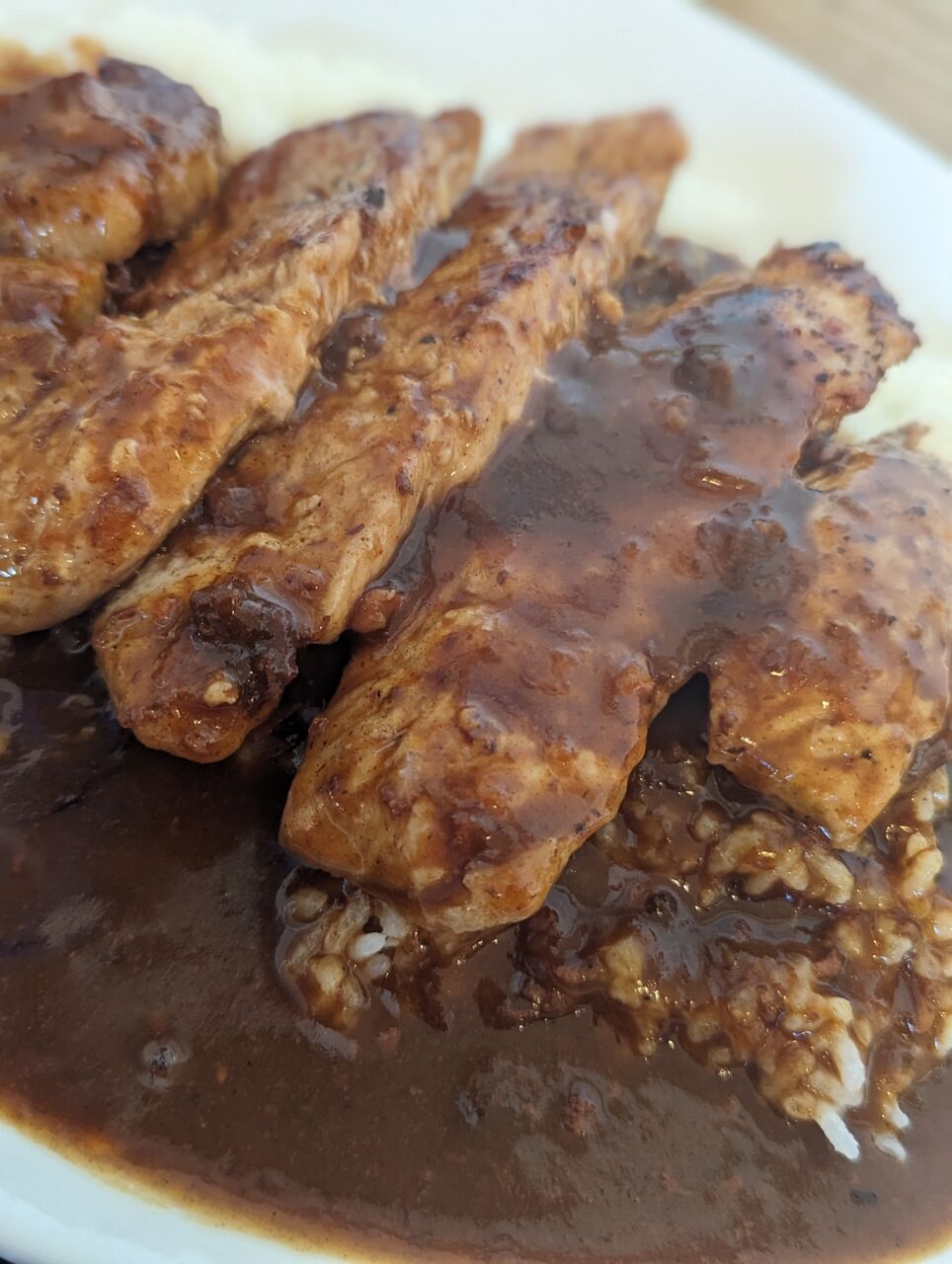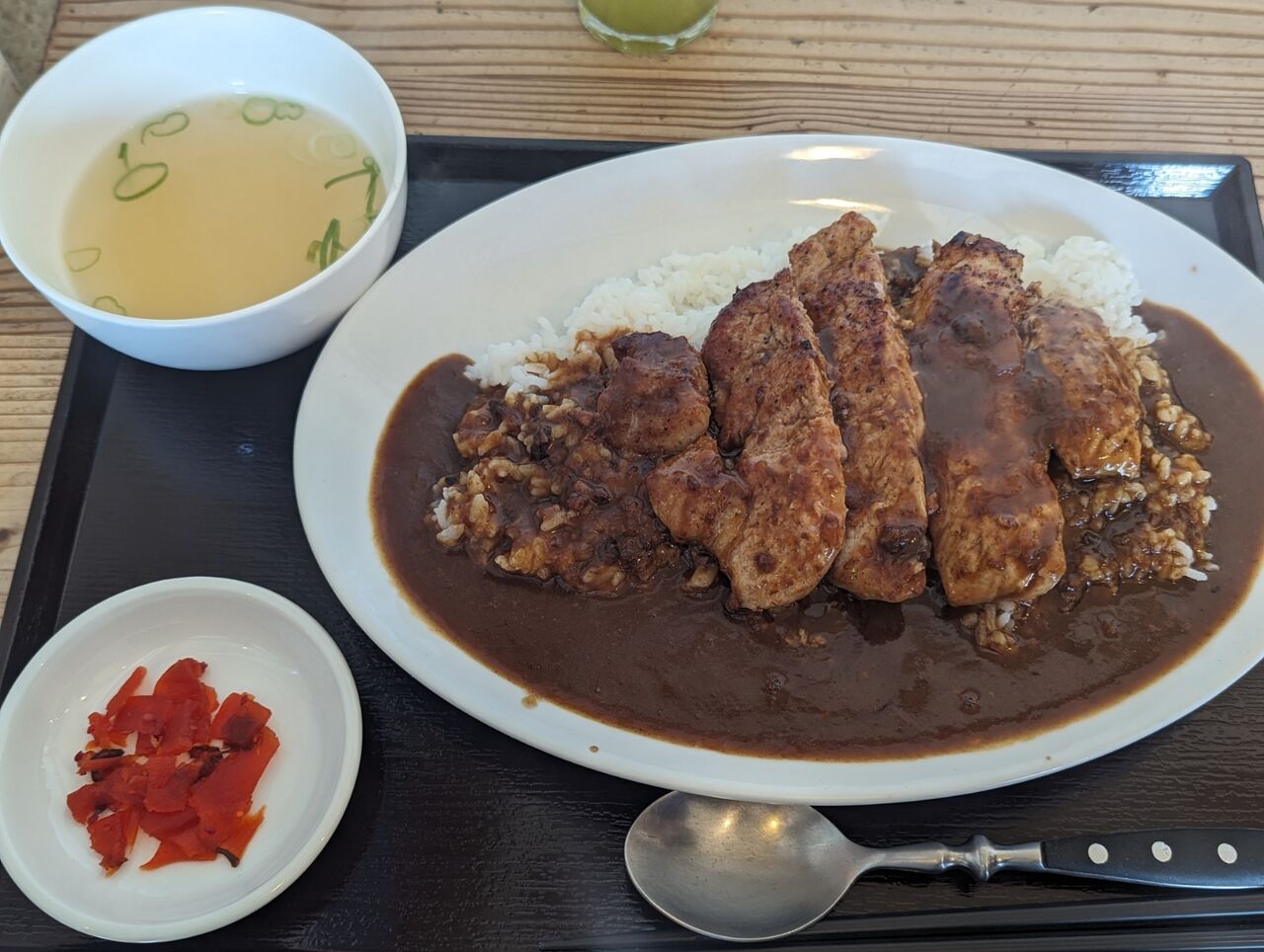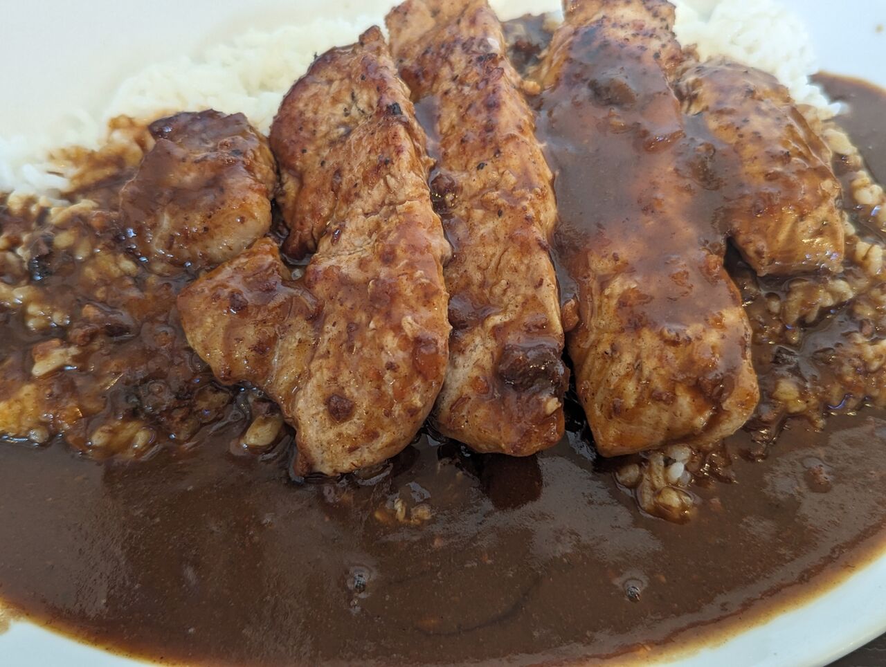 ・香ばしいトンテキが乗った甘口のカレーでした。トマトのような風味でコクのあるおいしいカレーでした。
