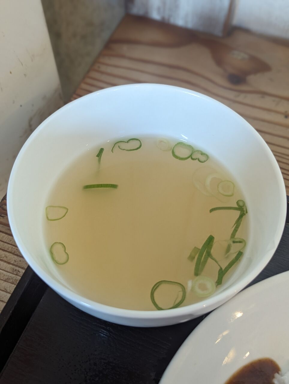 ・ご飯は「並」「大盛」「特盛」が追加料金なしで選べました。スープと福神漬けがついています。