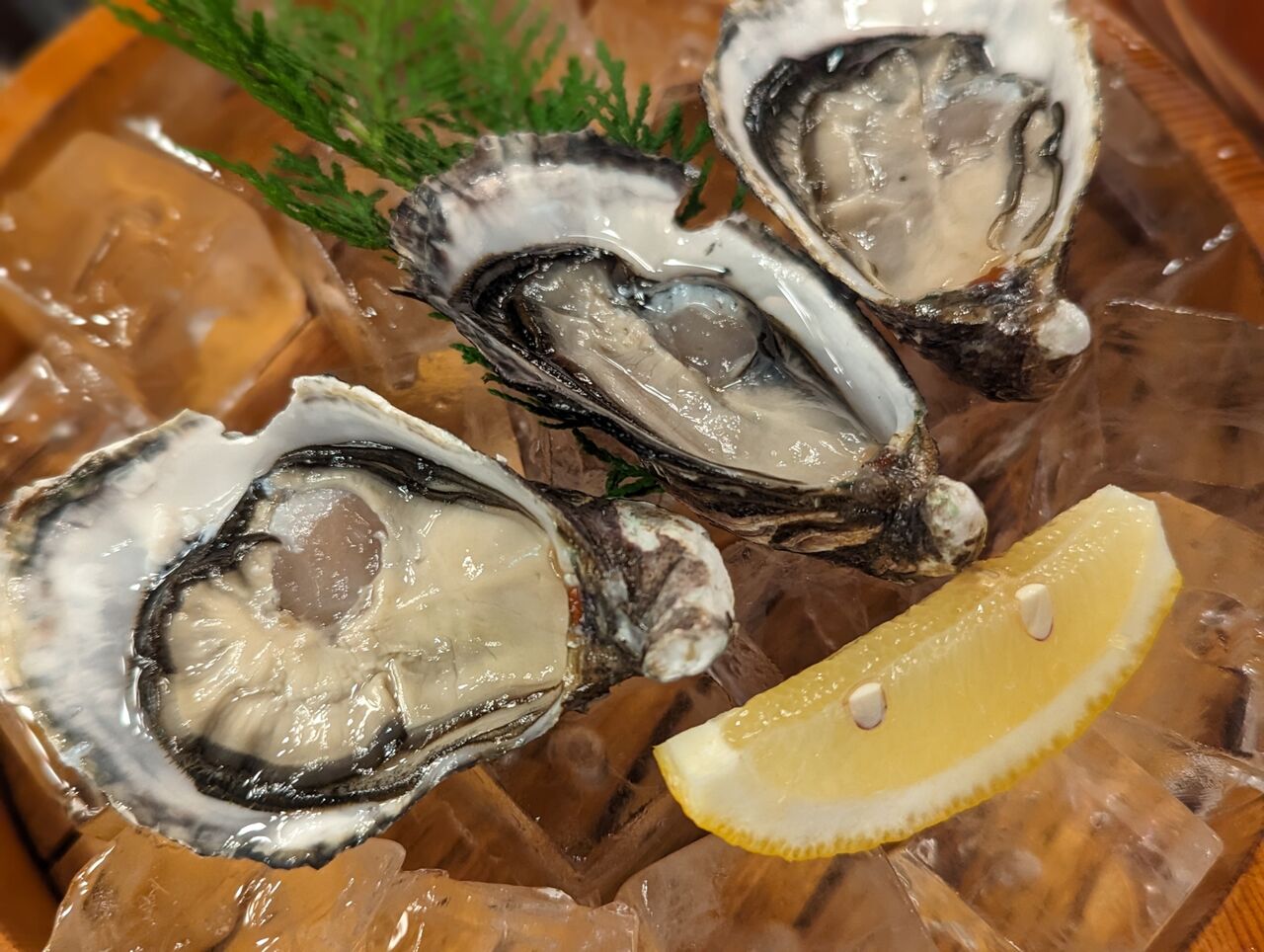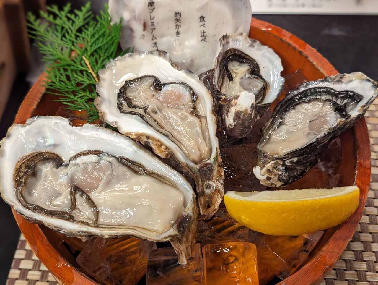 ・生牡蠣食べ比べ(的矢かき、伊勢志摩プレミアムオイスター)が最高だったので追加で生牡蠣3つづつ注文してしまいました。