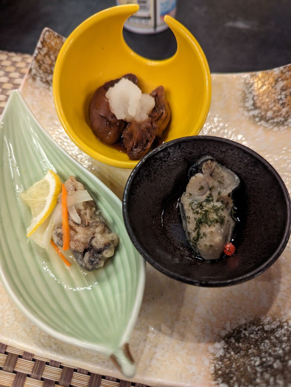・前菜は三種盛(佃煮、南蛮漬け、あおさ)など、全て牡蠣料理でした。