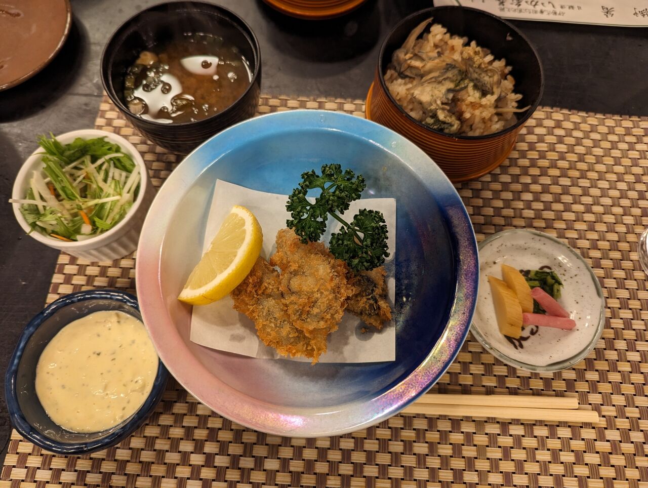 ・カキフライ、サラダ、牡蠣の味噌汁、牡蠣ごはん