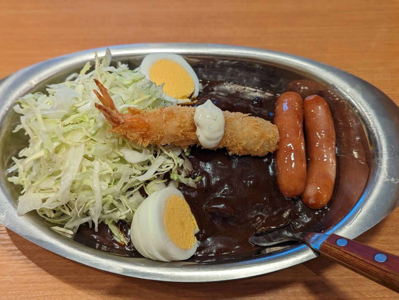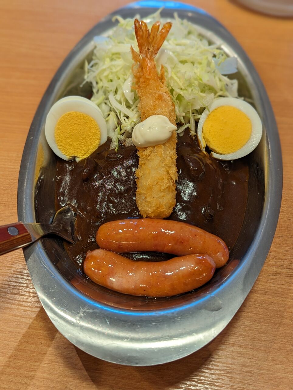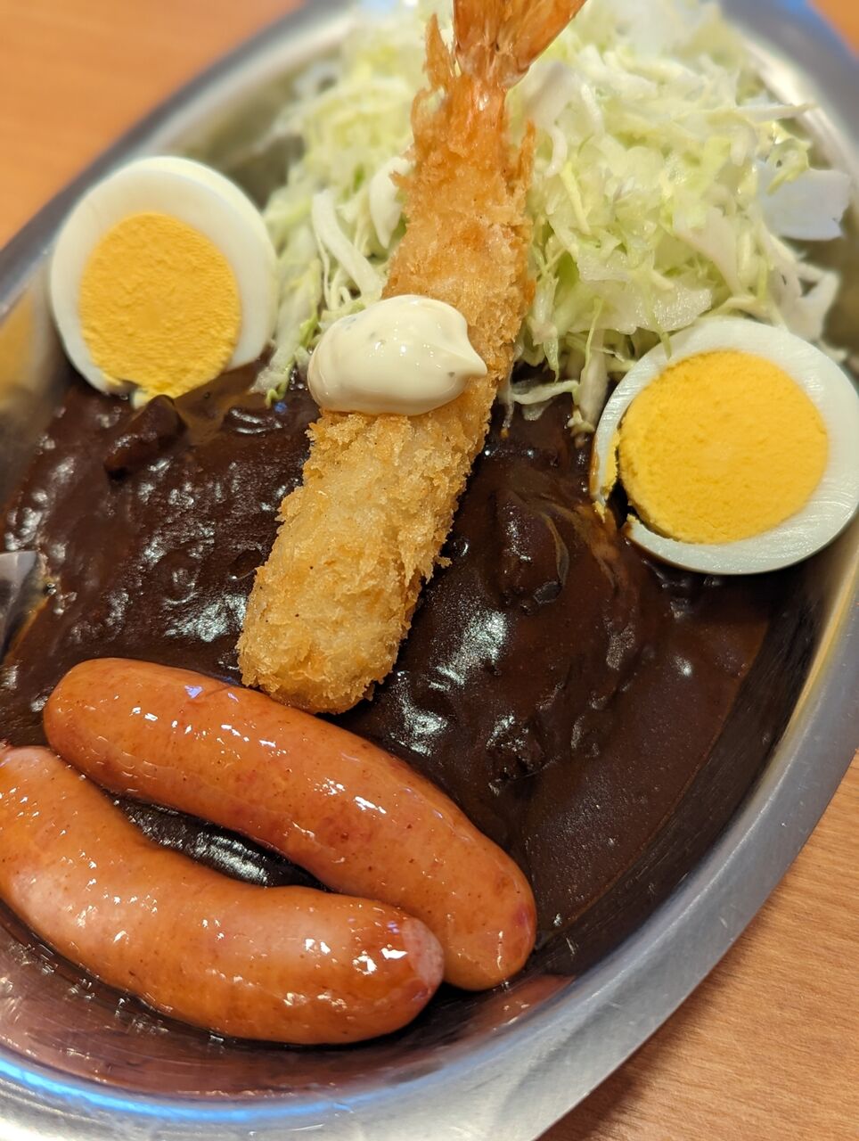 トンカツ🐷、チキンカツ🐓、海老フライ🍤、シャウエッセン🌭x2、ゆでたまご🥚が乗っかったフル装備カレー🍛💕✨
