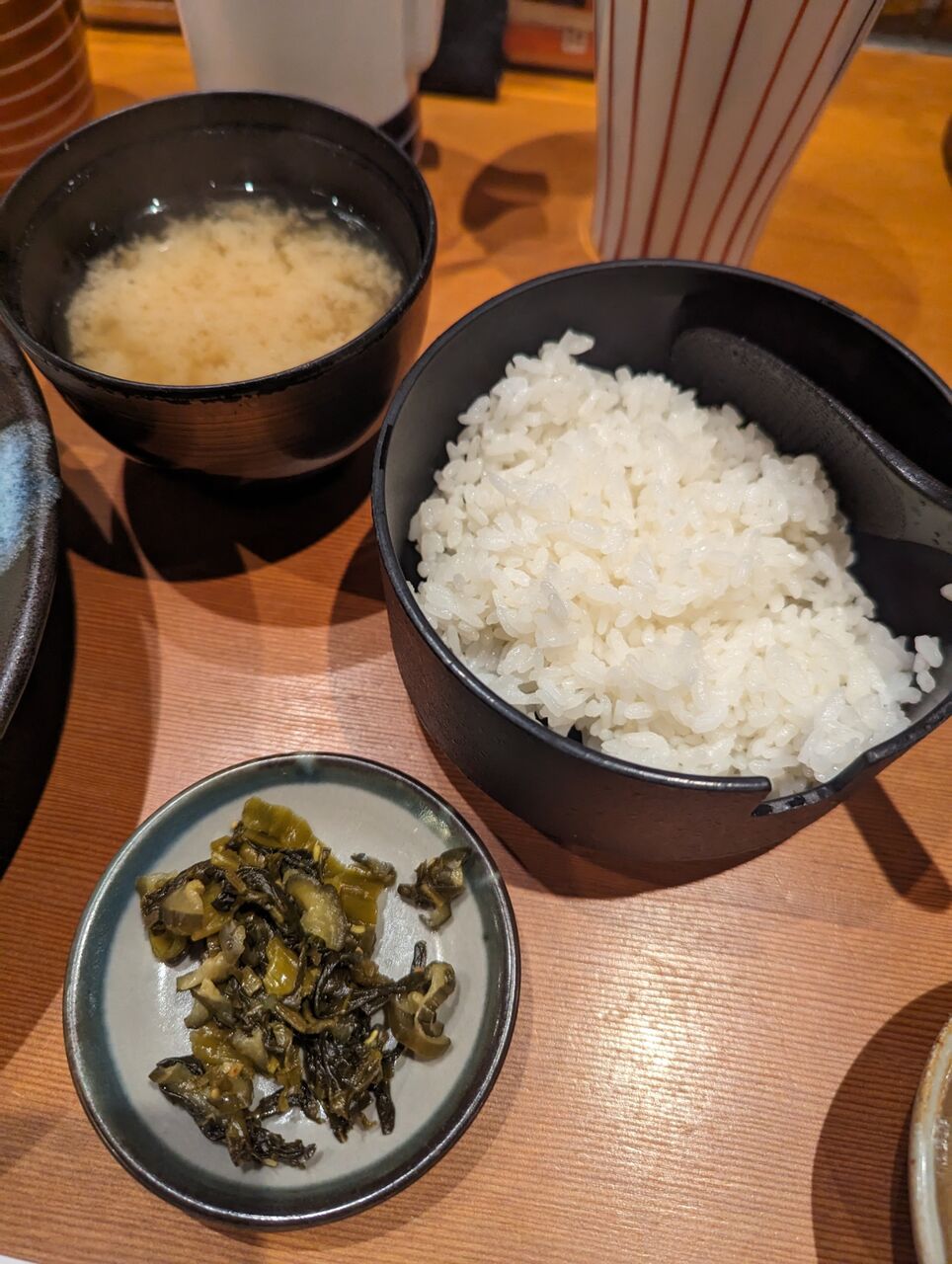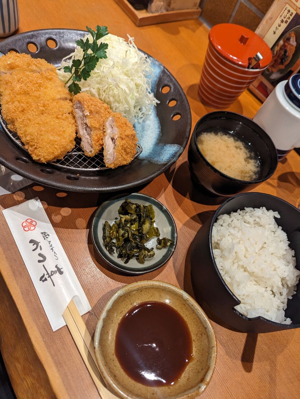 ・ごはん、味噌汁、キャベツのお代わり自由のお店です。みそ汁と漬物がおいしいのでご飯がすすみます。