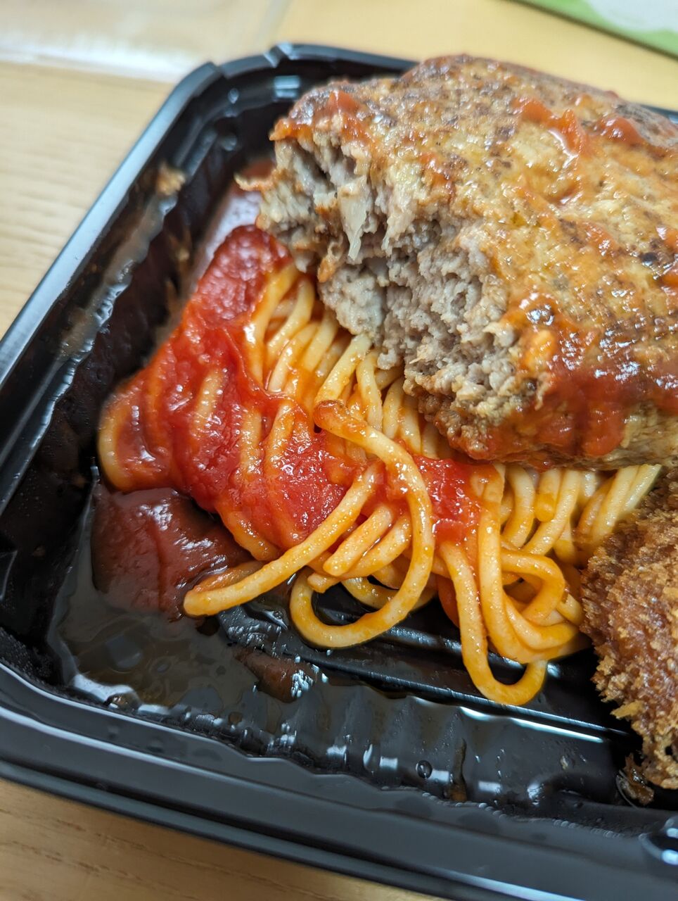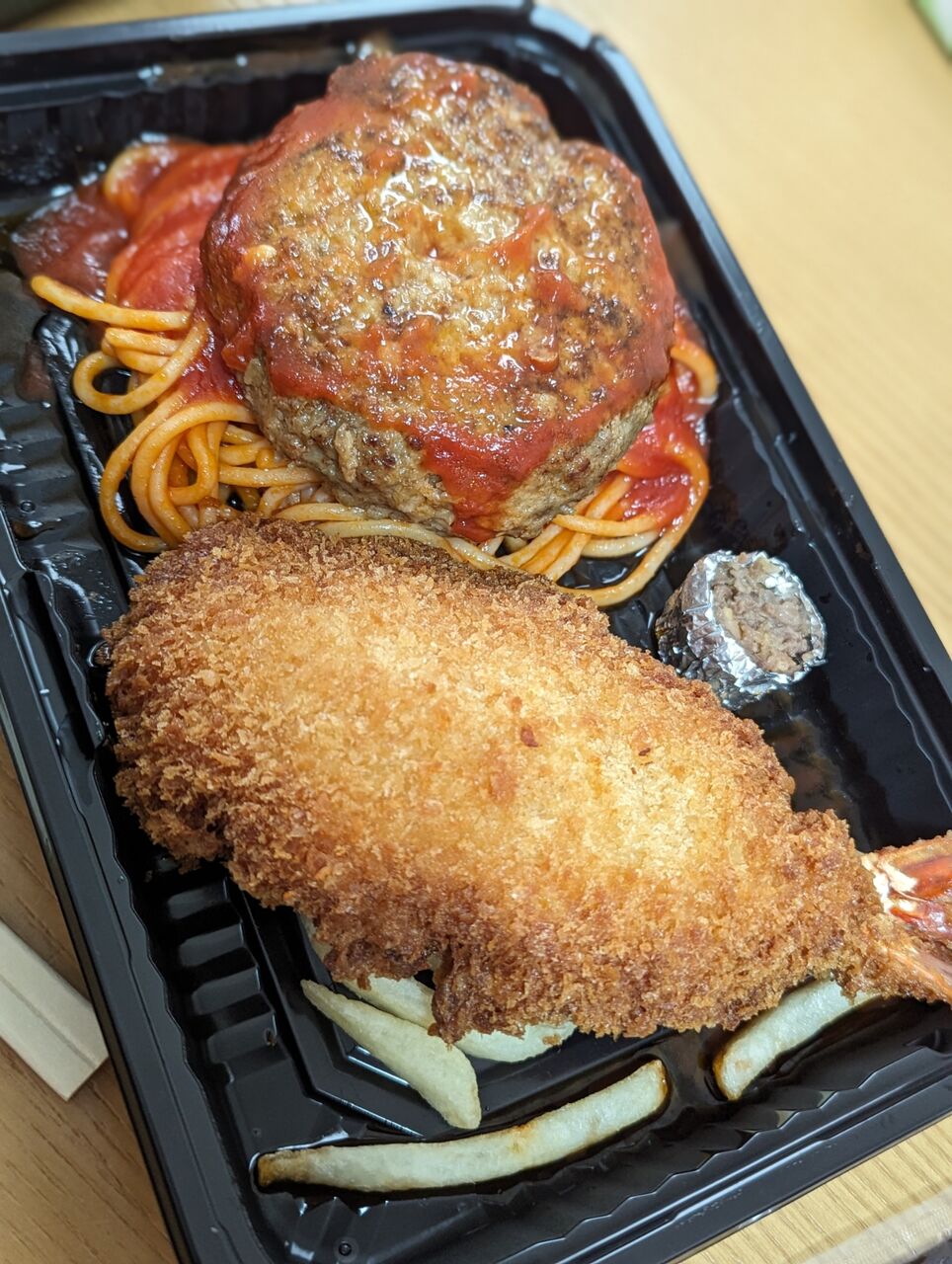 ・レストランと同じクオリティのハンバーグとエビフライとスパゲティが入っています。