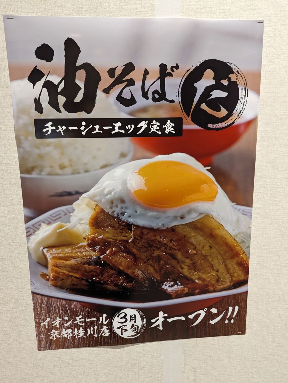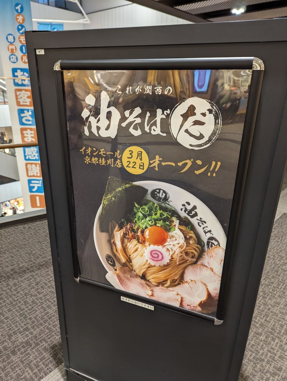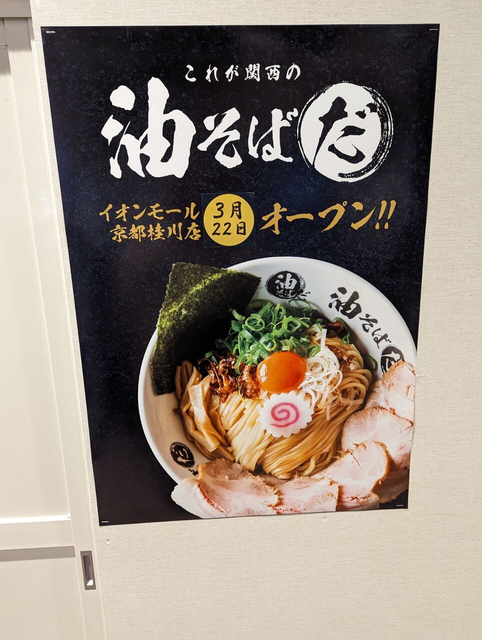 イオンモール桂川のフードコートに大阪発の【油そば専門店】が出店 2024年03月21日 イオンモール京都桂川の3階フードコートに、「これが関西の油そばだ」という油そばのお店が出店するようです。2024年3月22日にオープンすると現地に書いてありました。大阪の飲食企業がプロデュースする油そば専門店で京都初出店です。イオンモール桂川を含めると4店舗あります。・ラーメンの博多一風堂の隣の区画です。・イオンモール桂川のフードコートは入れ替えが激しいですが、他のフードコートには無いような変わったお店も多いので今回も楽しみです。▼お店の場所イオンモール京都桂川京都市南区久世高田町376−1▼運営会社公式サイト 「◇開店・閉店情報」カテゴリの最新記事 < 前の記事次の記事 > コメント コメントフォーム 名前 コメント 記事の評価 リセット リセット 顔 星 情報を記憶 コメントを投稿する