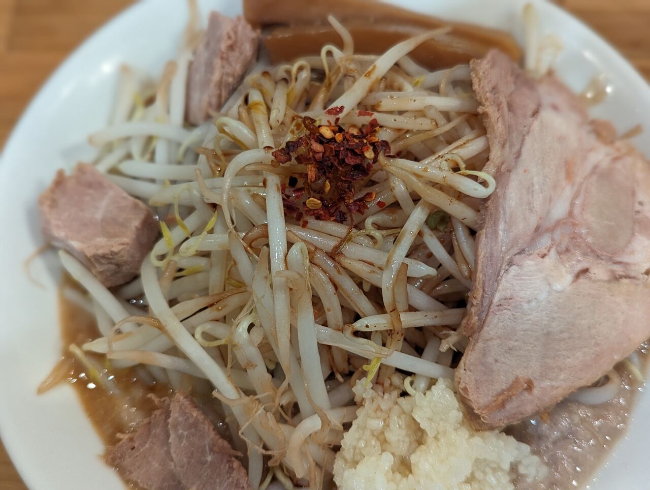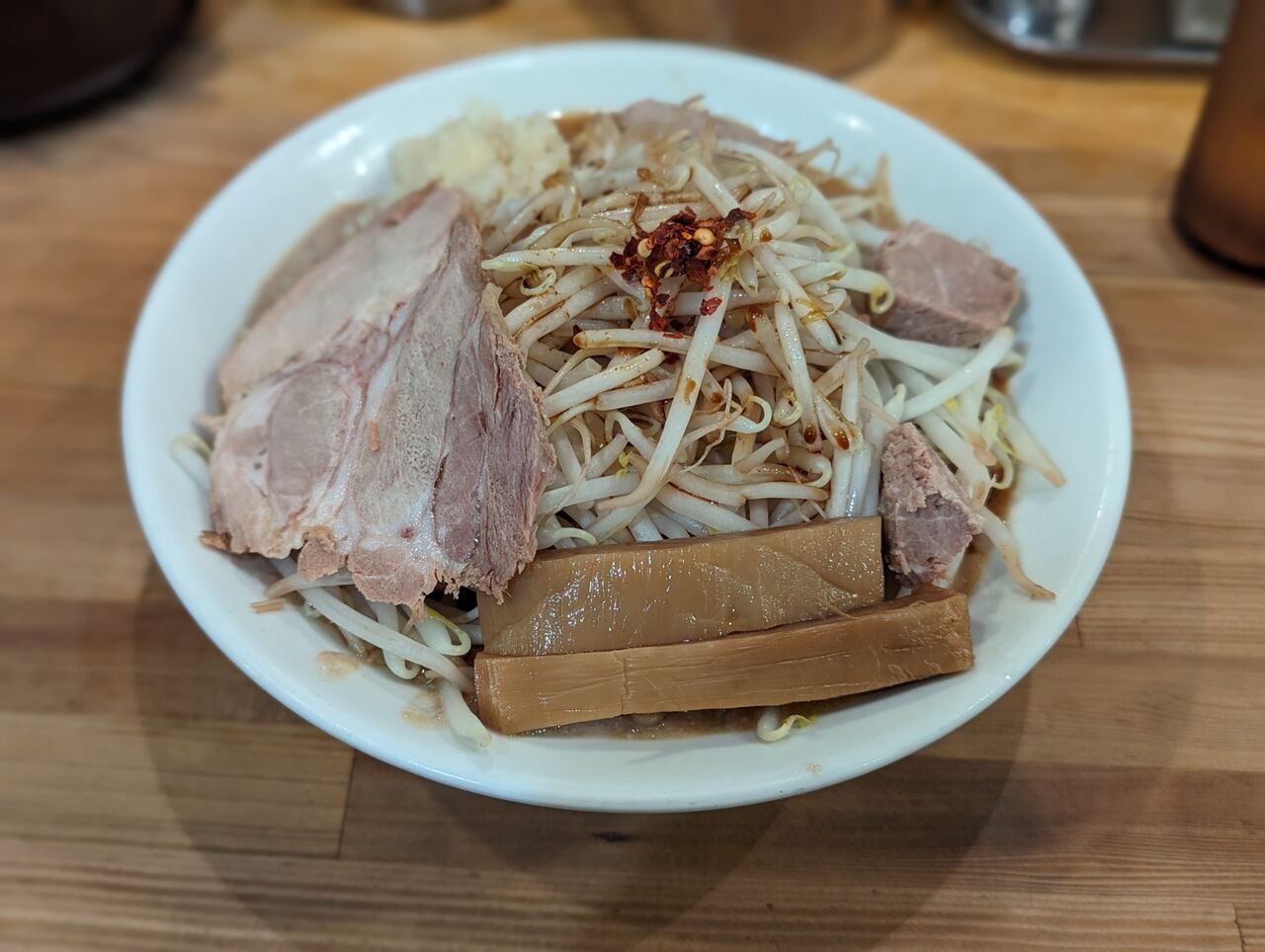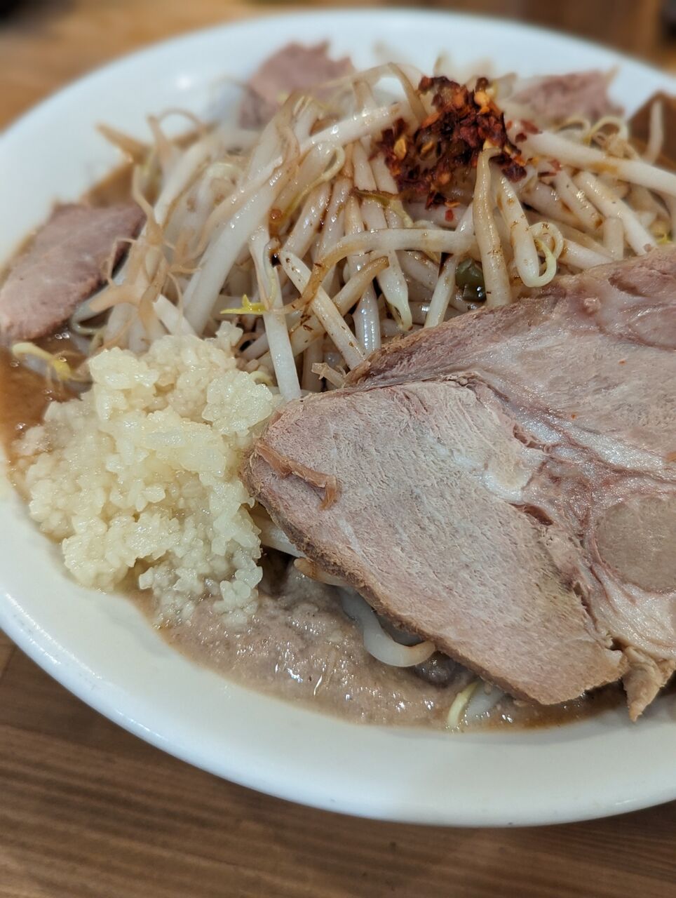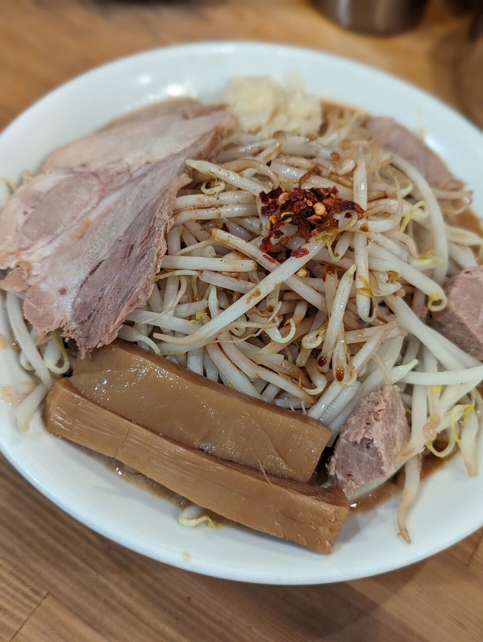 ・モヤシとニンニクの効いた感じとチャーシューの物量で、二郎系の感じがはっきりありました。最初は「二郎系」の味がして、後半は「鶏だく」の味に戻っていく感じでした。