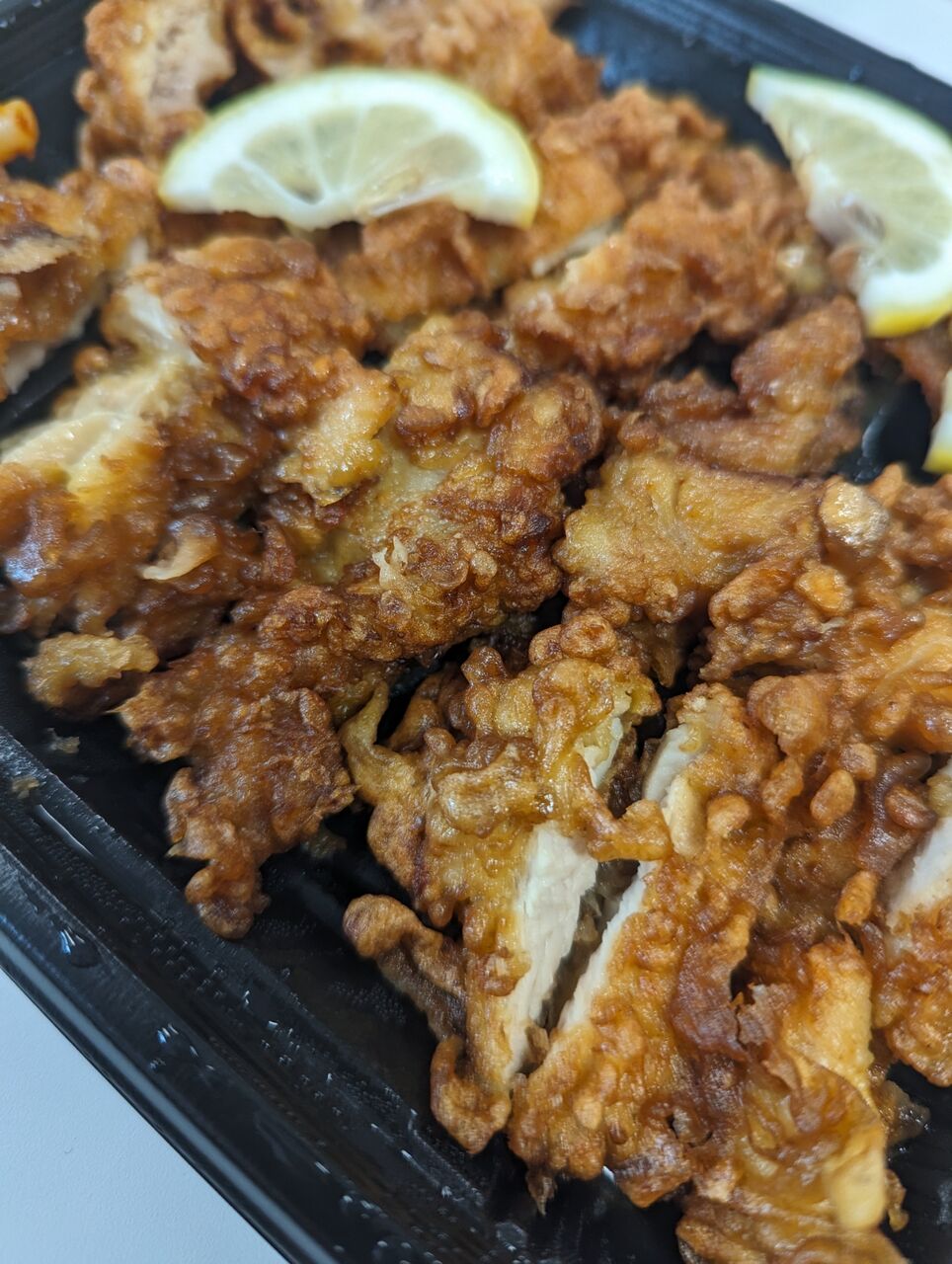 ・とんかつのように薄切りにした鶏肉を揚げてからカットしてあります。カットレモンの風味がアクセントになります。弁当箱まるごと唐揚げなので量はたっぷり入っています。