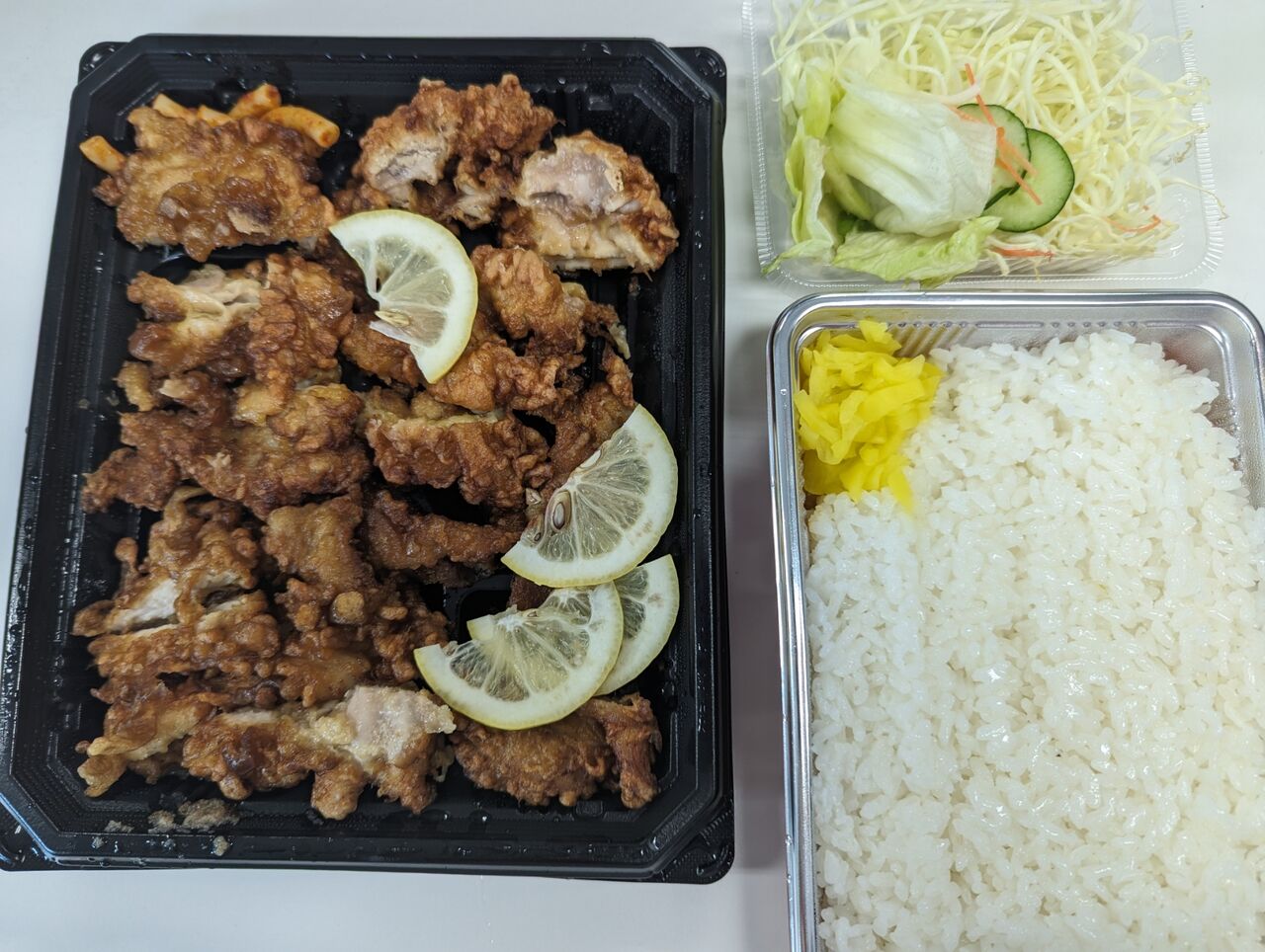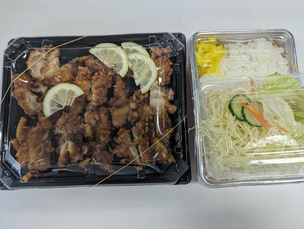 ・ほぼお店と同じぐらいの量の唐揚げが入っていました。お店ではマスタードとウスターソースをかけて食べていますが、Ubereatsの弁当にはついていないので事前に用意しておく必要があります。