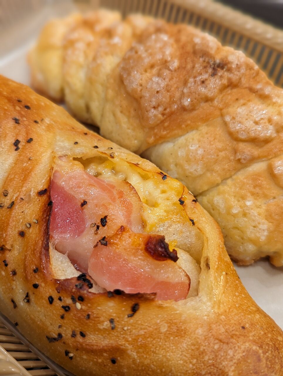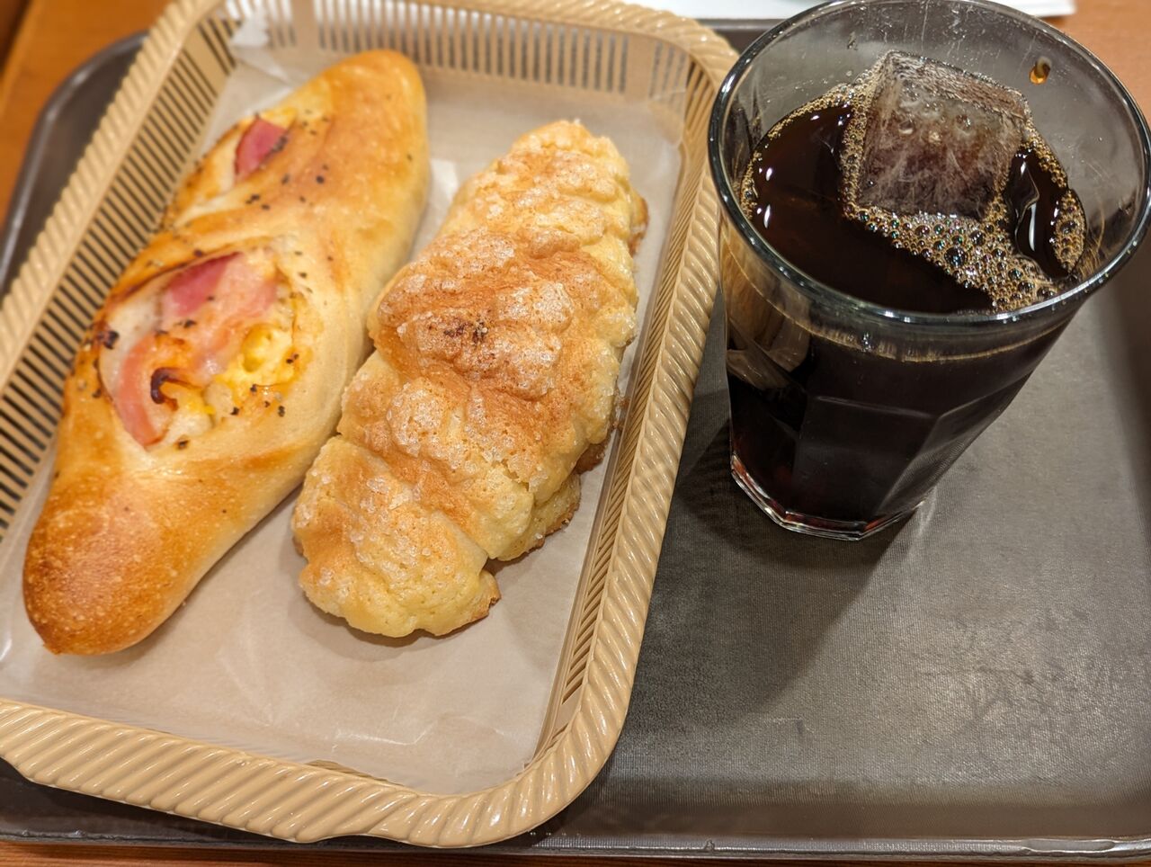 塩バターメロンパン、ベーコンチーズフランス、アイスコーヒー 660円(モーニング割引価格)