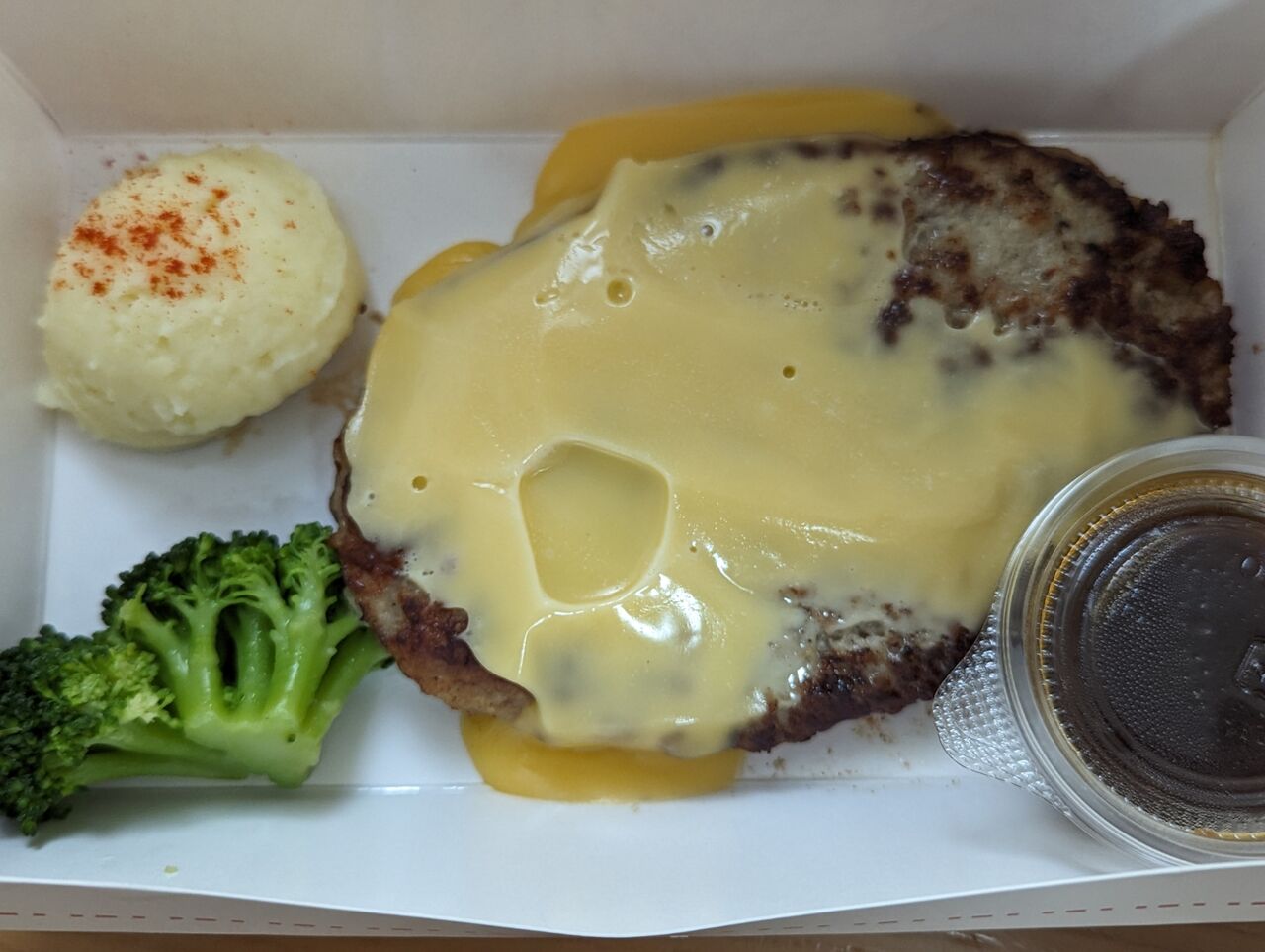 チーズハンバーグ(200g)、黒デミハンバーグ(200g)、スパイシーポテト、ライス並(2人前) 3302円