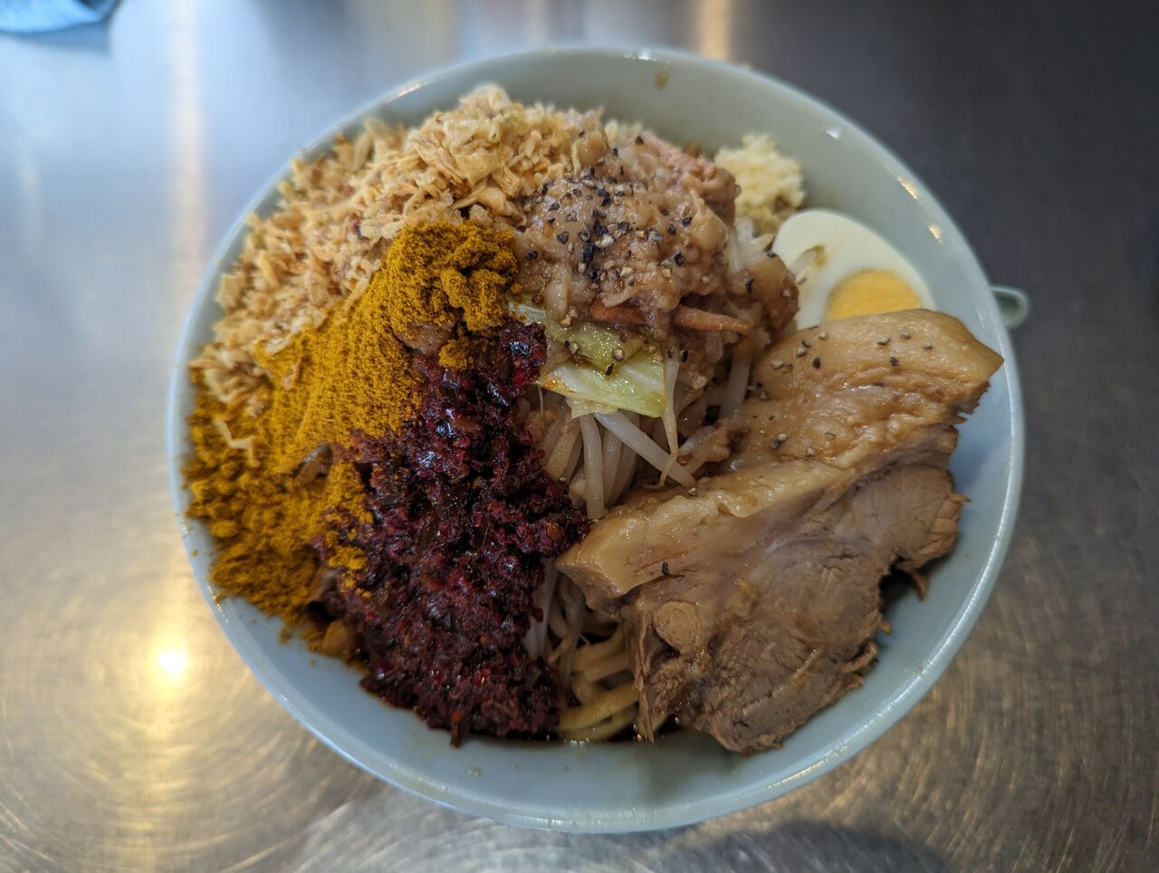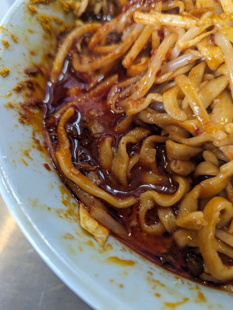 ・スープは真っ赤で唐辛子ベースの辛ダレが効いています。後味はカレーパウダーが口内に広がる最高の組み合わせでした。最初にしっかり混ぜ込んだ方がおいしくなります。