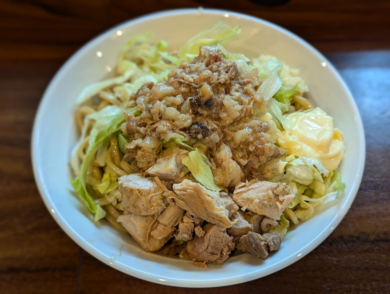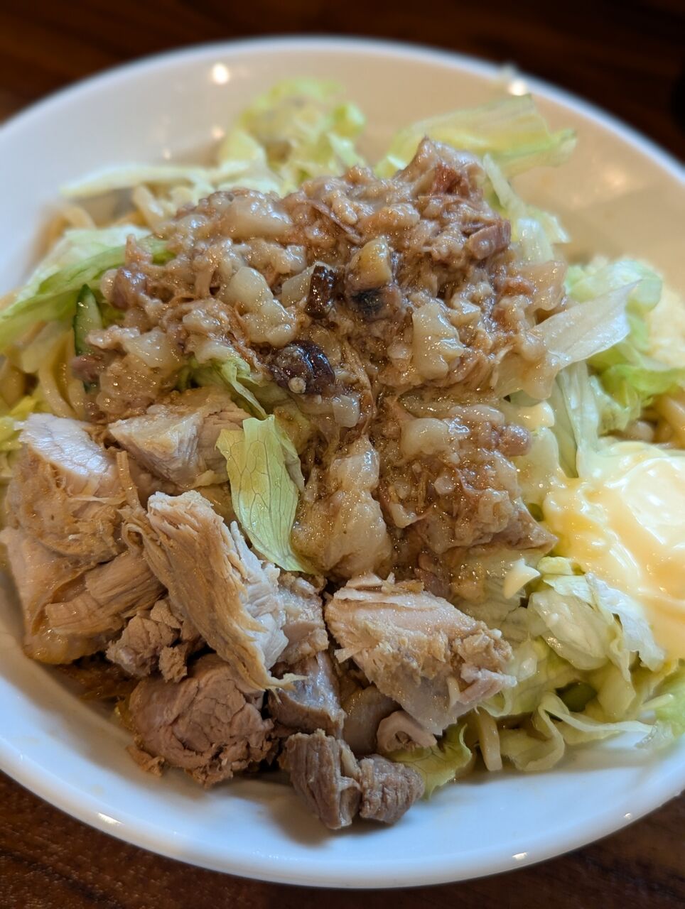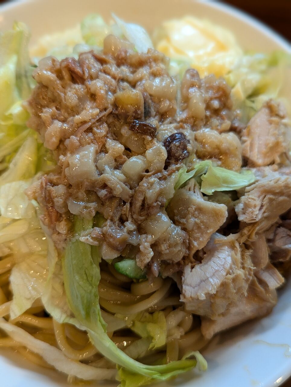 ・酸味の効いた冷麺ダレとニンニクとマヨネーズが絶妙なバランスでした。具材はレタスと豚とアブラが乗っています。