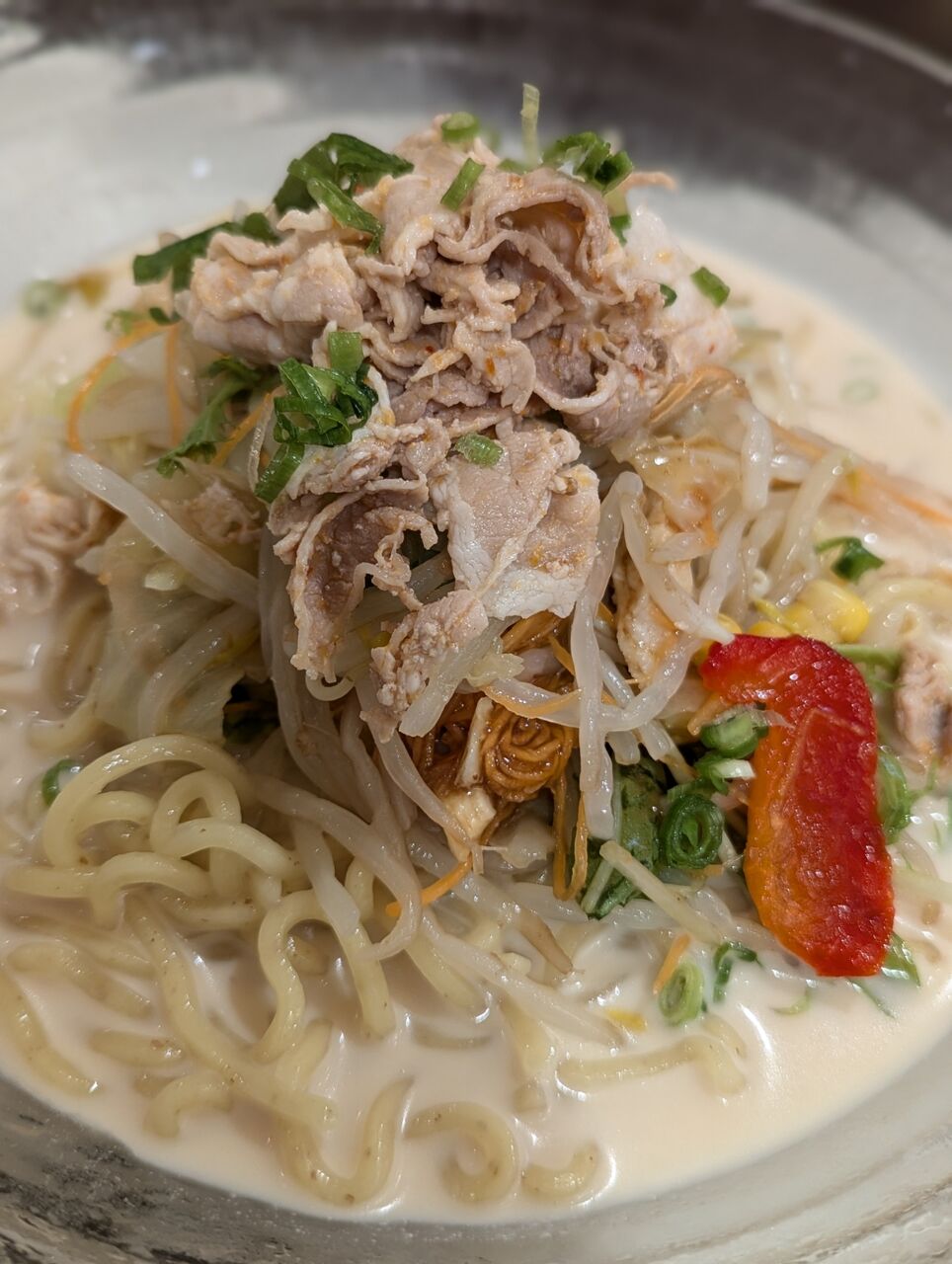 ・冷しゃぶ(豚)と野菜がたっぷり乗っています。よく冷えたちゃんぽんスープとガラスの丼が清涼感がありました。