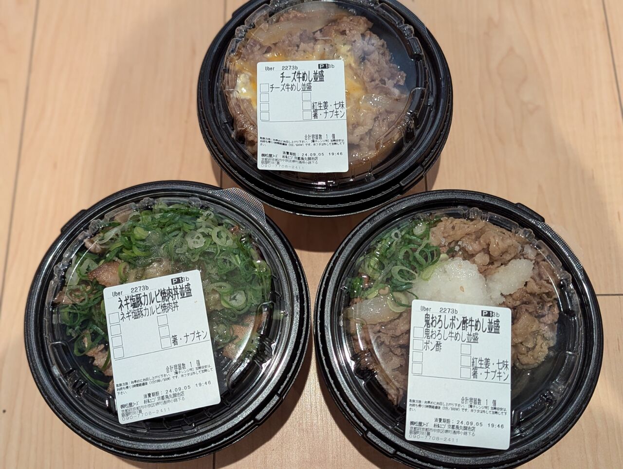 1200円以上の注文で配達手数料も割引だったので「チーズ牛めし」と「鬼おろしポン酢牛めし」と「ネギ塩豚カルビ丼」 1476円【割引後・配送料含む】を注文しました。