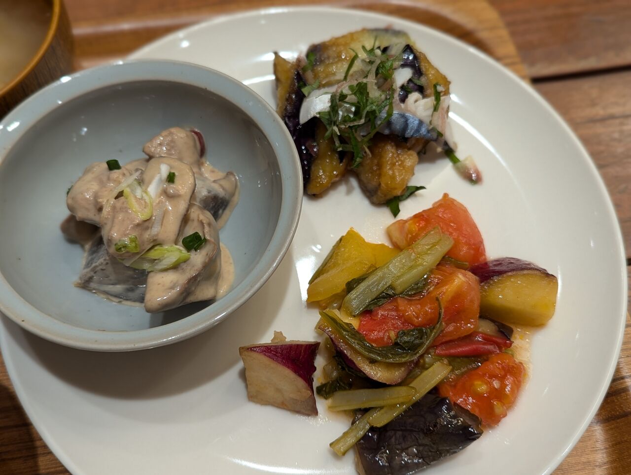 ・「レバーと蒟蒻の辛子マヨネーズ和え」「茄子のタタキしめさば添え」「秋野菜の南蛮炒め」を選択しました。