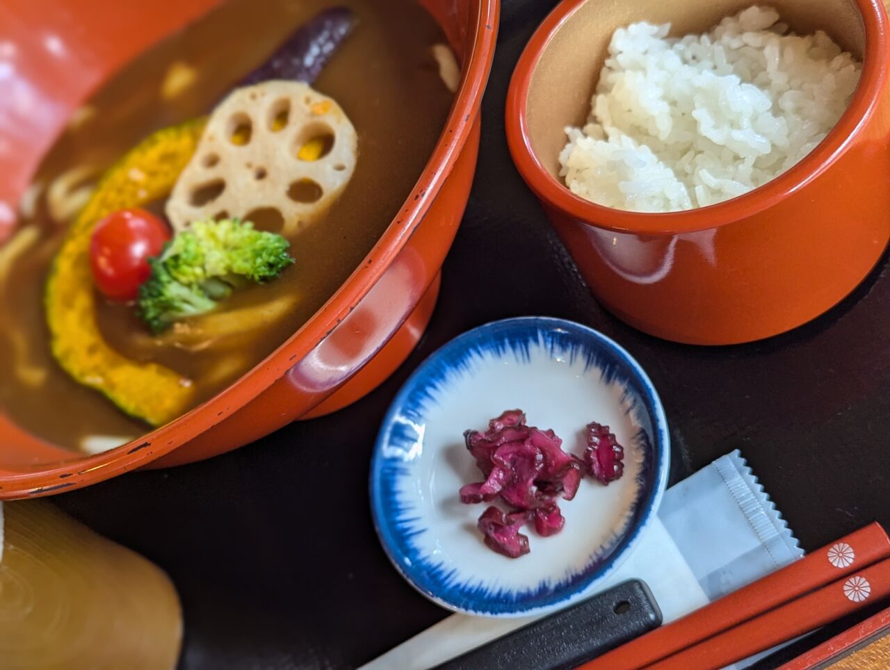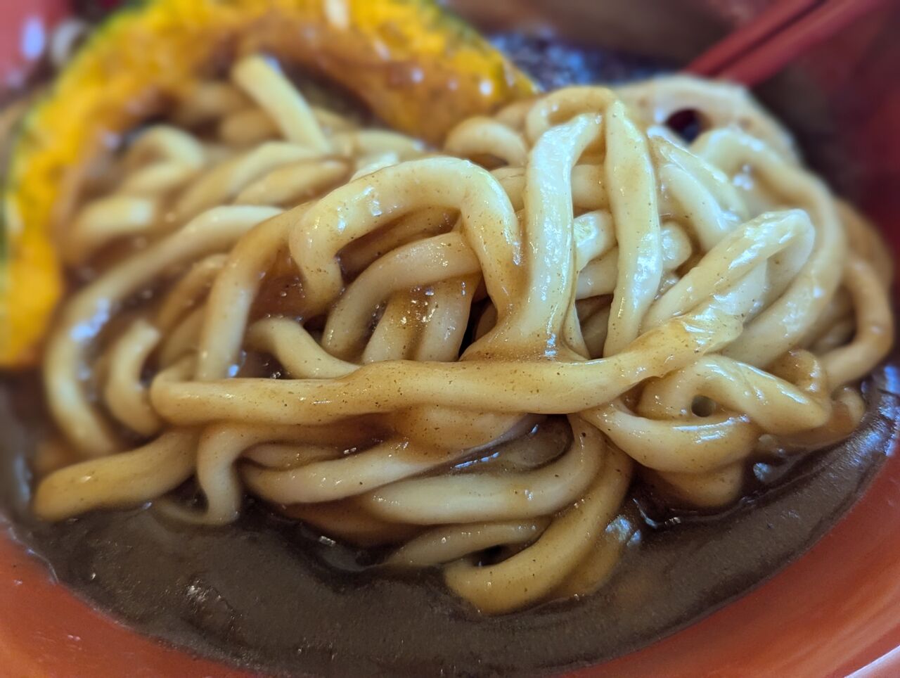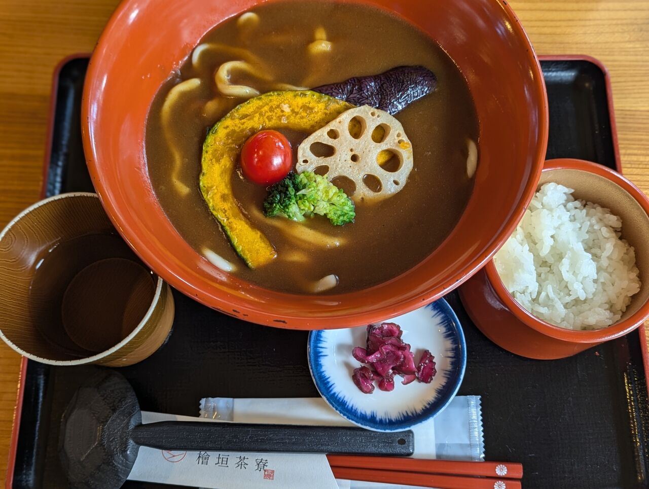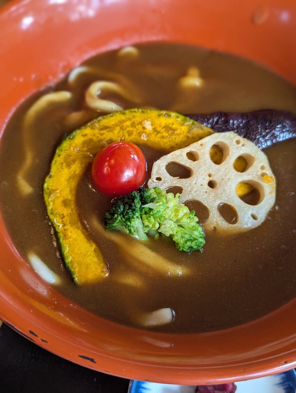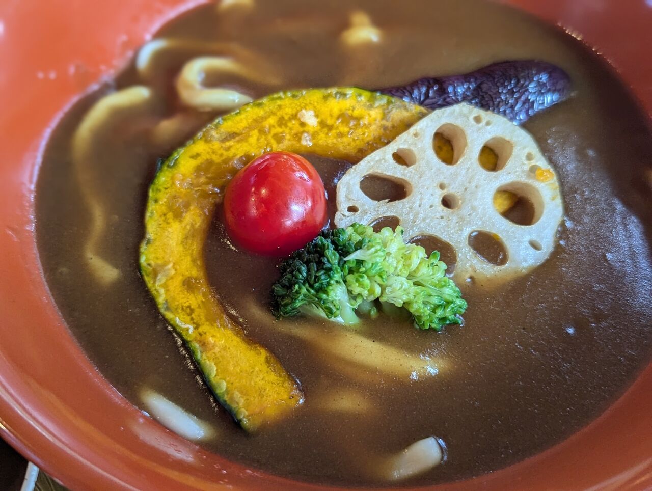 ・素揚げした野菜が乗ったカレーうどんでした。餡掛け出汁にカレーがよく合います。うどんもしっかり入っていました。