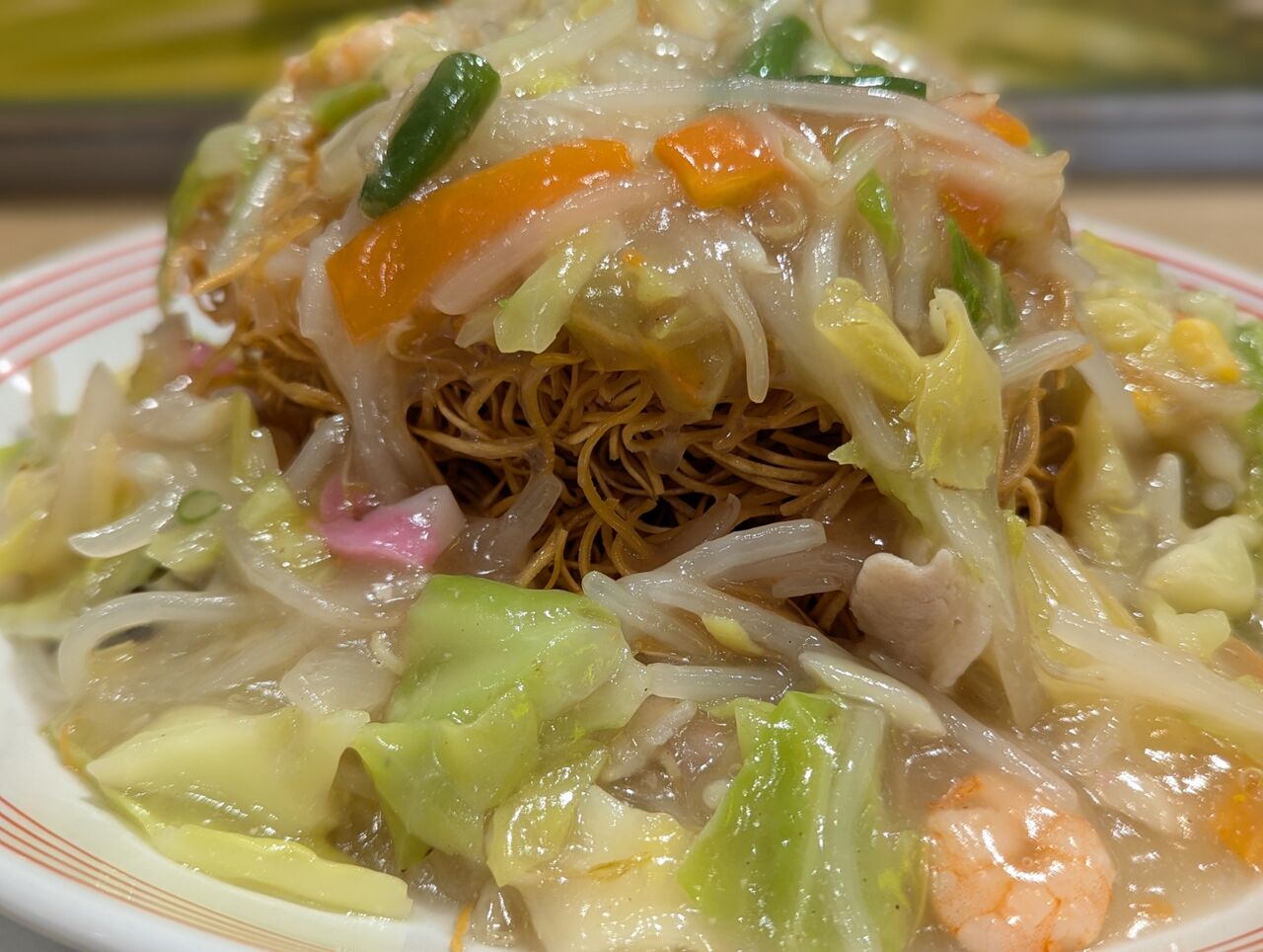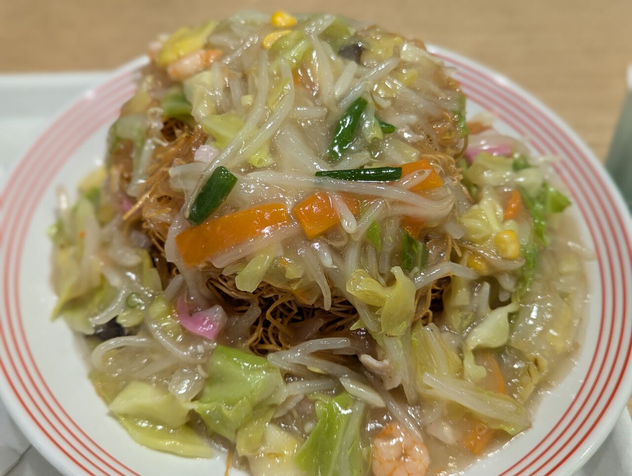 ・皿うどんが2段積みになっていて食べ応えありました。酢とカラシで味変しました。