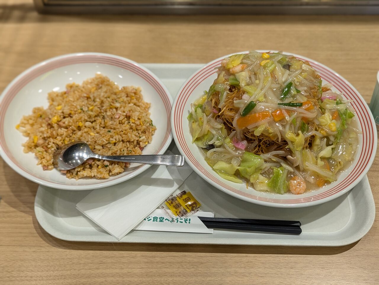 そこでイオンモール北大路のフードコートにあるリンガーハットで食べる事にしました。長崎皿うどんの麺量2倍と、「チャーハン並盛ありますか?」と聞くと半チャーハンしかメニューにはないけれど半チャーハン2個注文してくれたら1皿に盛りますとの事なのでそうしてみたらお盆からはみ出る大きさになってしまいました。