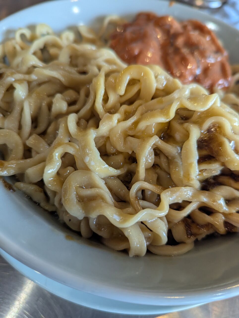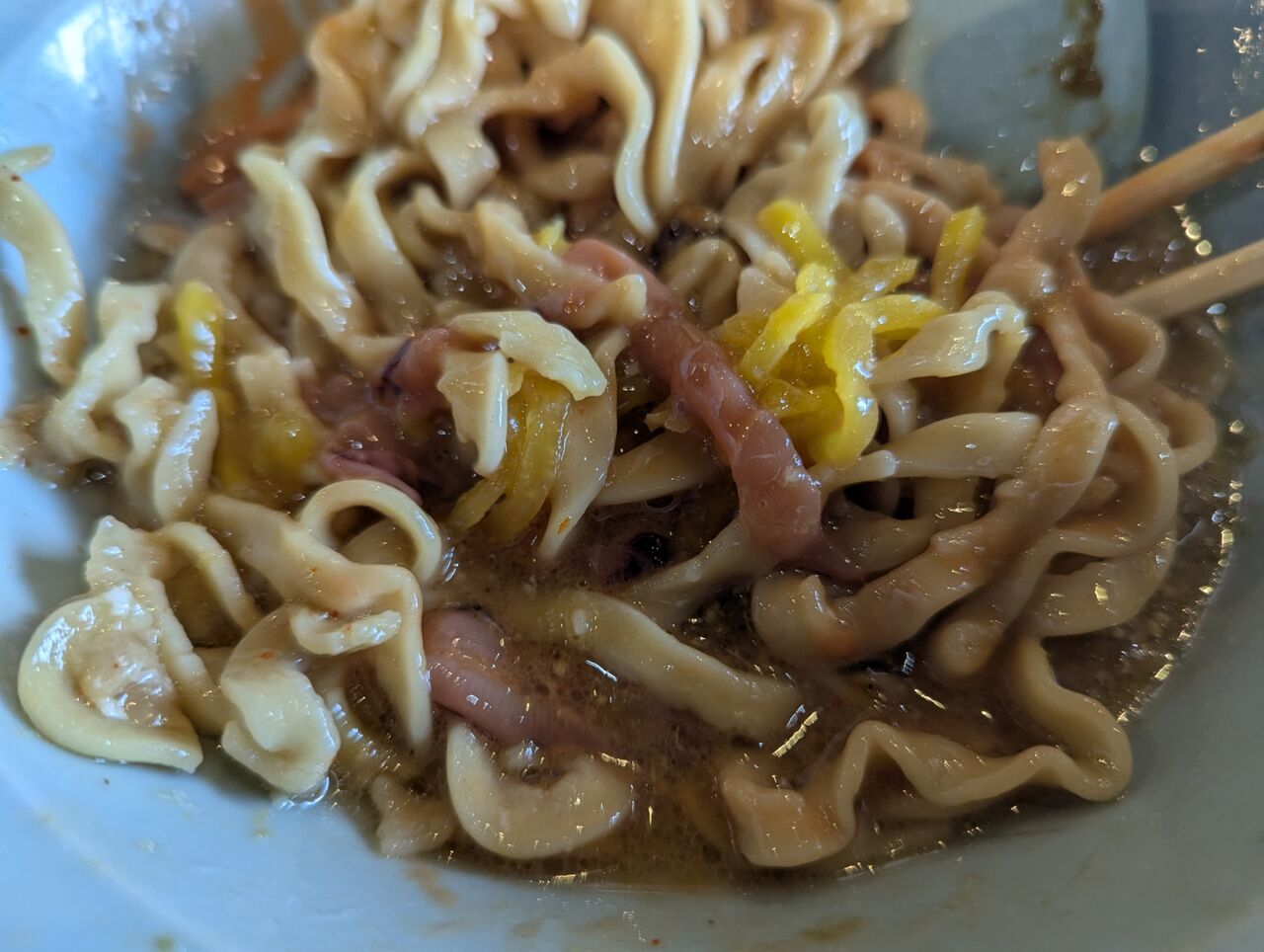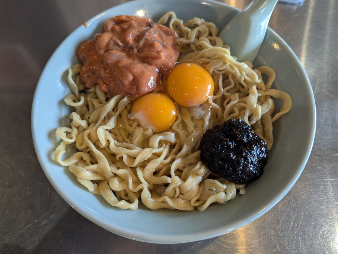 ・生卵とイカの塩辛と岩海苔、たくわんが入ったまぜ麺でした。温かい極太麺で食べ応え抜群でした。