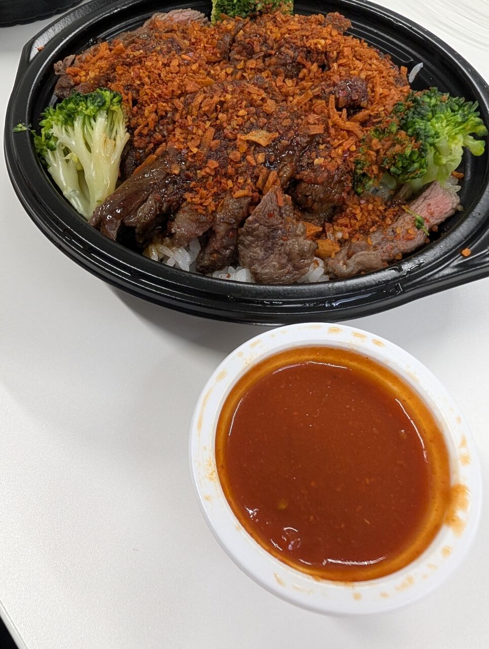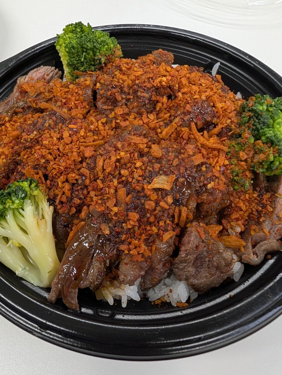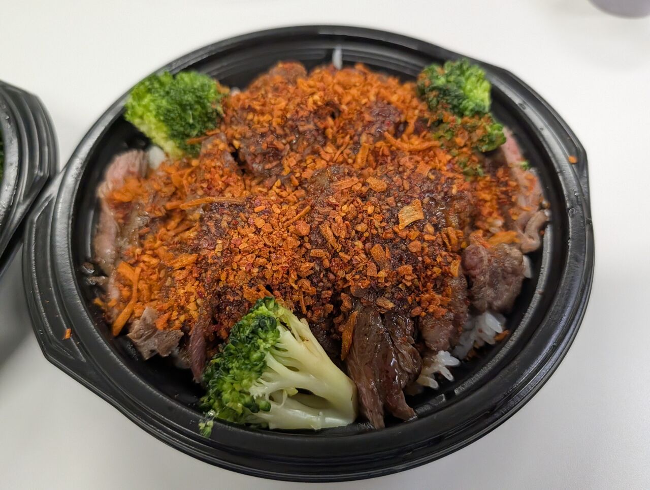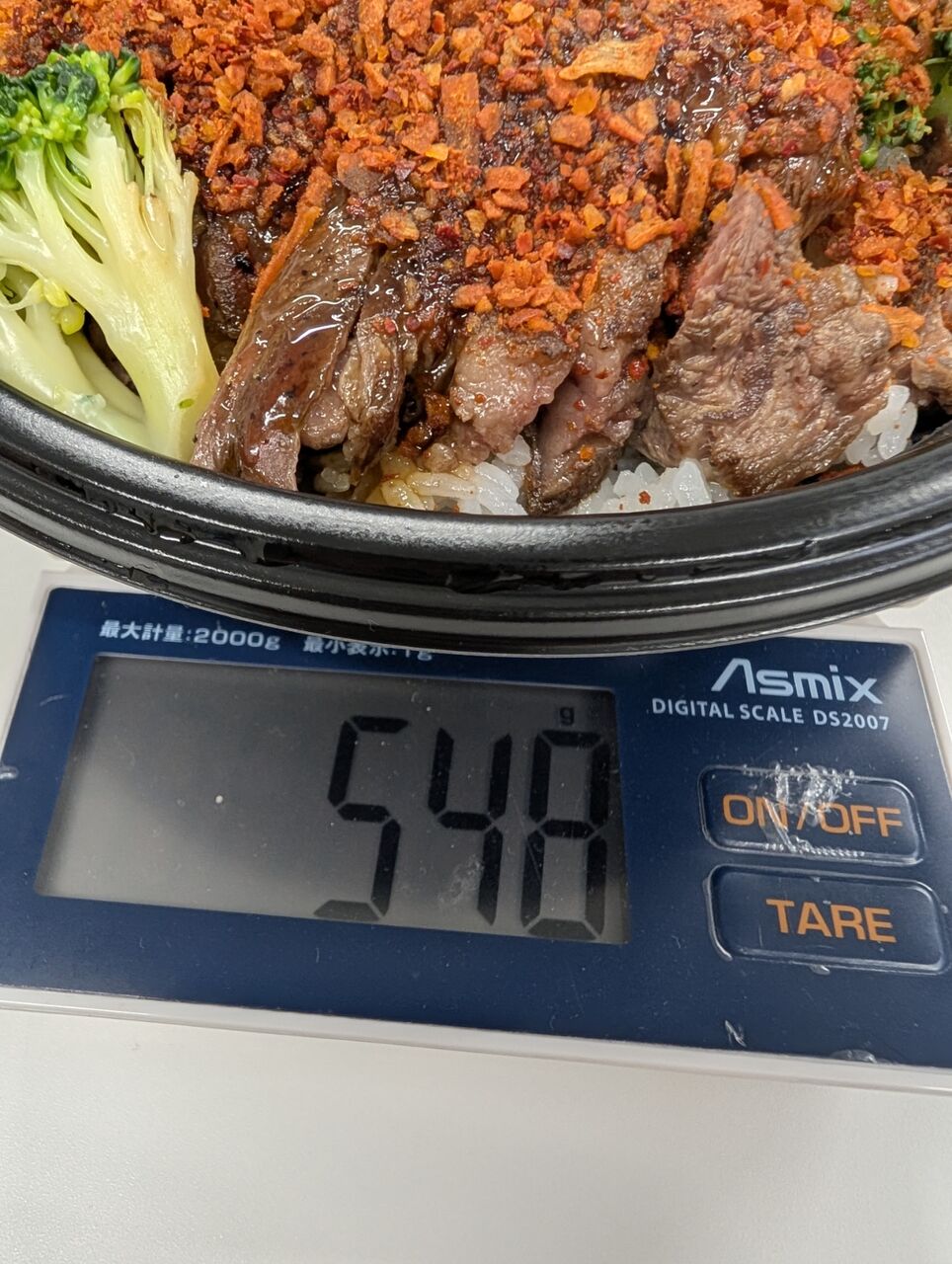 ・ステーキ丼HOTの方は、毛沢東スパイスのような辛いニンニク系のザクザクスパイスがまぶしてありトマトベースのソースをかけて食べると相当ジャンキーな味わいでした。総重量548gなのでこちらも大盛サイズでした。