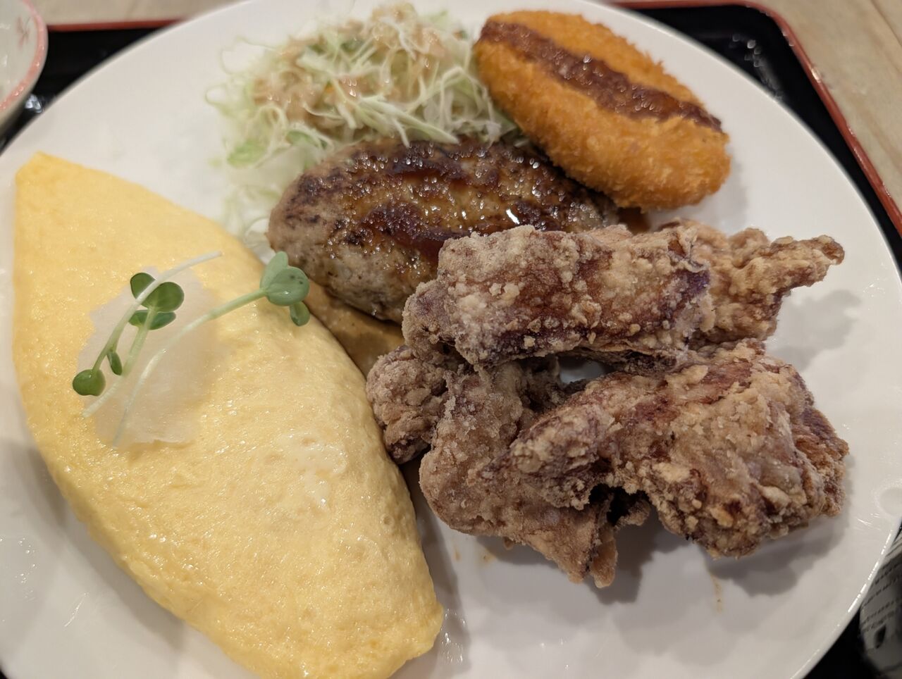 ・オムレツ(玉子100%)と唐揚げとコロッケ、ハンバーグの定食です。味付けはやや薄味でしたがボリュームは申し分ありませんでした。