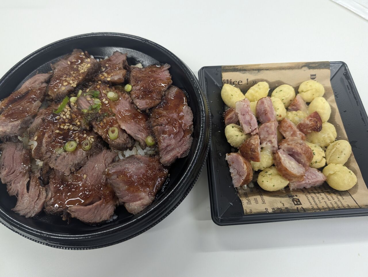 特製牛ハラミステーキ丼(肉増量)「ご飯大盛」、揚げニョッキとパンチェッタの盛り合わせ 2827円【配達料込】